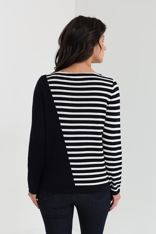 Пуловер выполнен в черно-белой цветовой гамме с выразительным полосатым узором. Одна сторона пуловера выполнена в широкую полоску, а другая – однотонная, что придает ему оригинальность и динамичность.