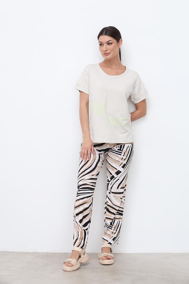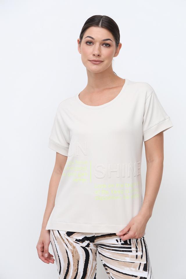 Бежевая футболка Bianca из мягкого хлопка с модальным волокном и принтом "SUN SHINE". Обладает свободным кроем и короткими рукавами, идеально подходит для создания повседневных образов. Состав: хлопок 65%, модал 30%, эластан 5%