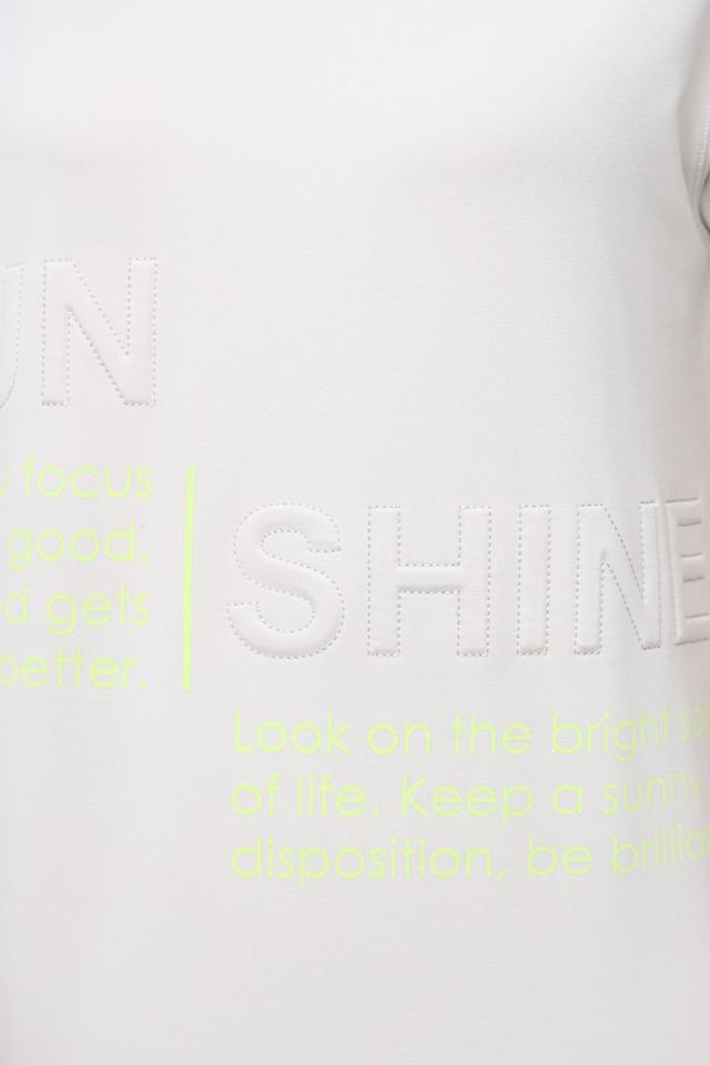 Модель имеет свободный крой, который обеспечивает комфорт в носке и позволяет создать расслабленный образ. Короткие рукава делают футболку идеальным выбором для теплой погоды. Особенностью данной модели является оригинальный принт "SUN SHINE" на лицевой стороне, выполненный в светло-зелёном цвете.