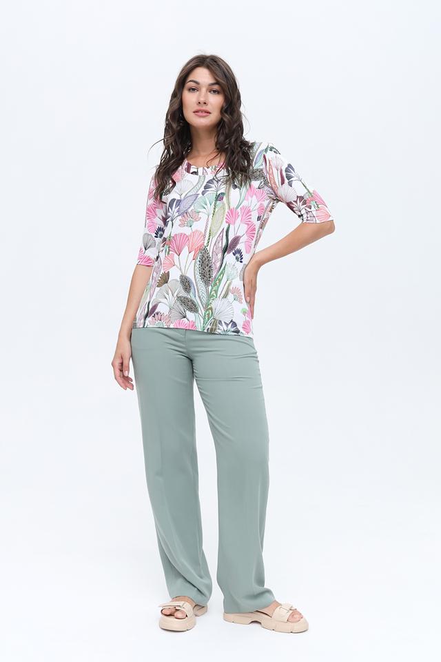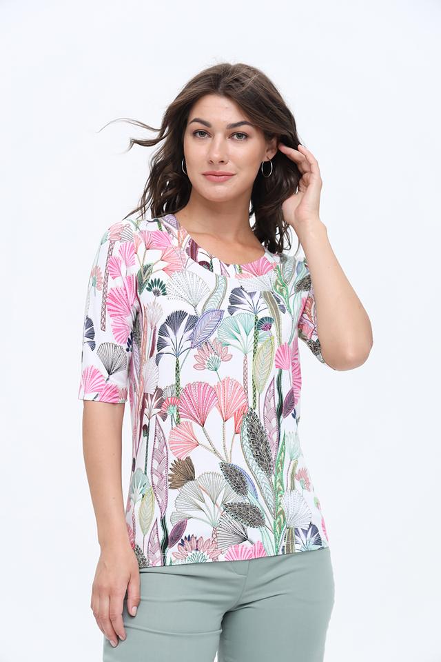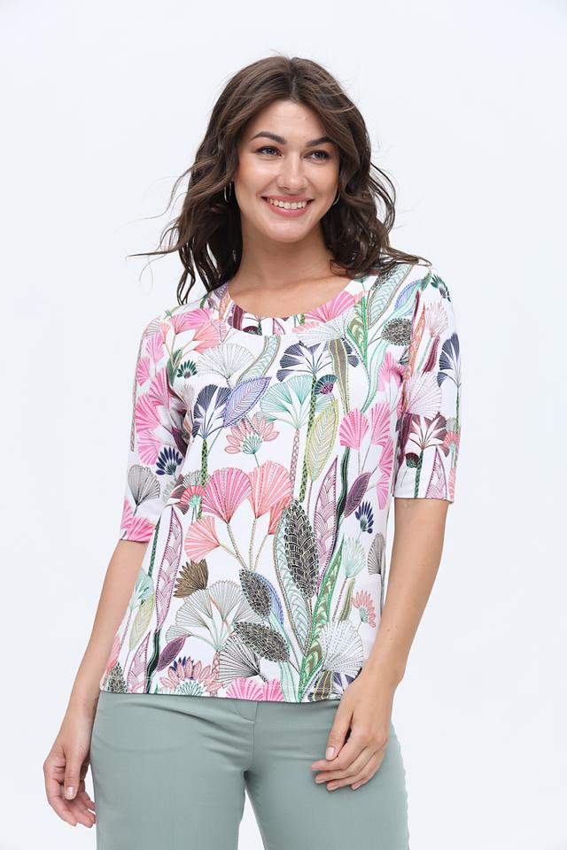 Блуза имеет прямой крой и короткий рукав, что делает ее универсальной для различных образов. Основной цвет блузы – белый, а яркий цветочный принт добавляет ей женственности и оригинальности.