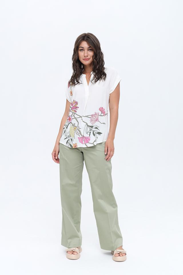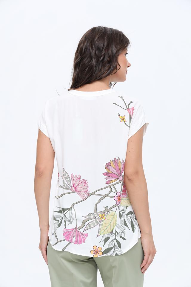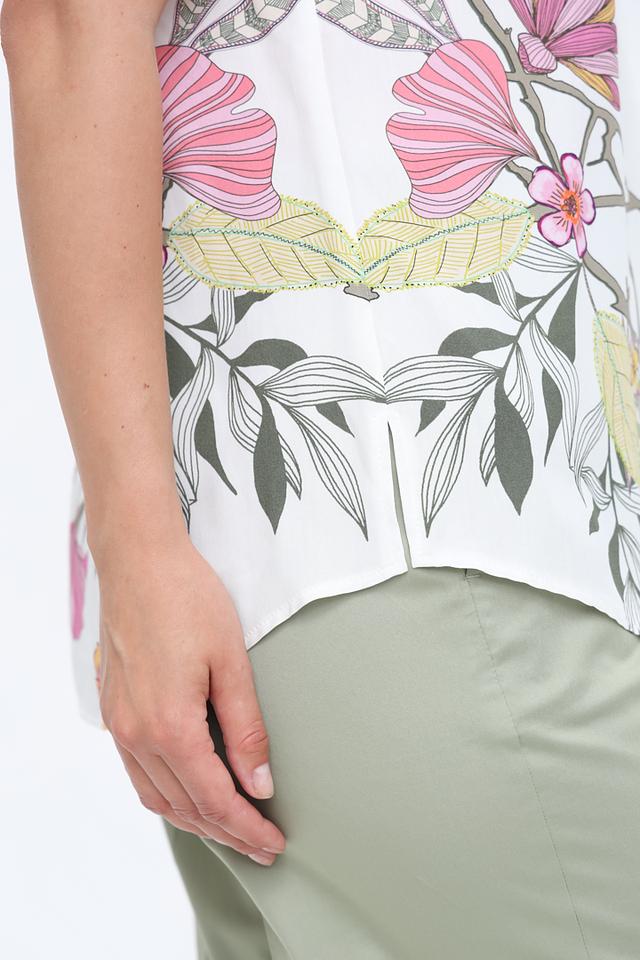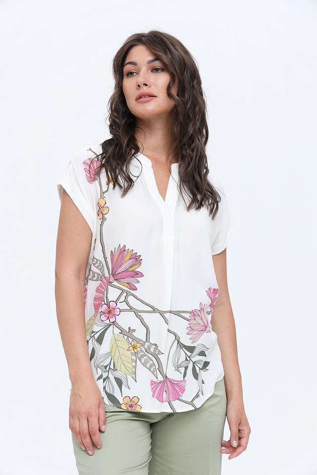 Основной цвет блузы – белый, который служит отличным фоном для яркого и красочного цветочного принта. Рисунок выполнен в нежных розовых, жёлтых и зелёных тонах, создавая романтичное и лёгкое настроение.