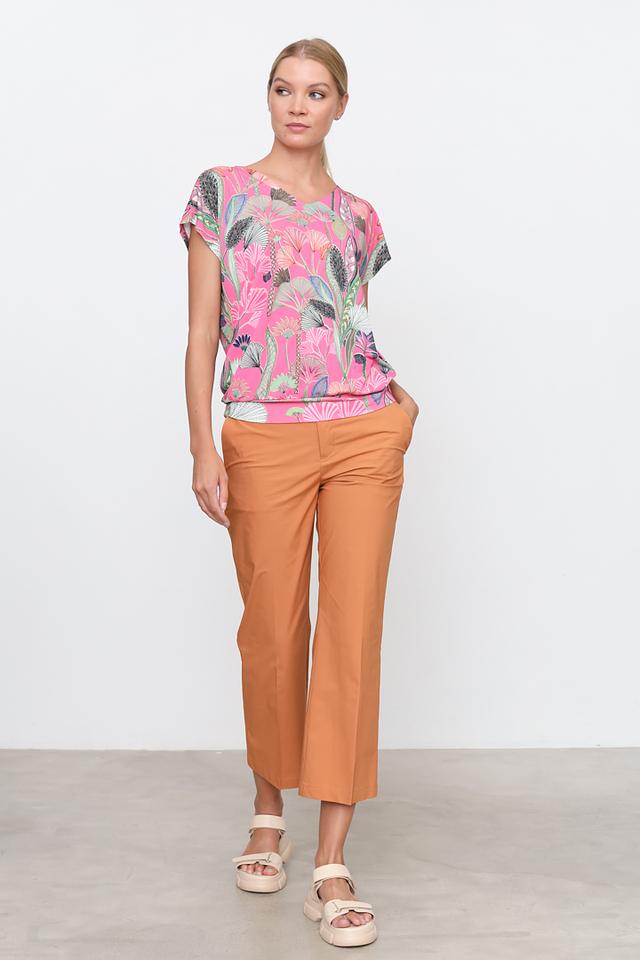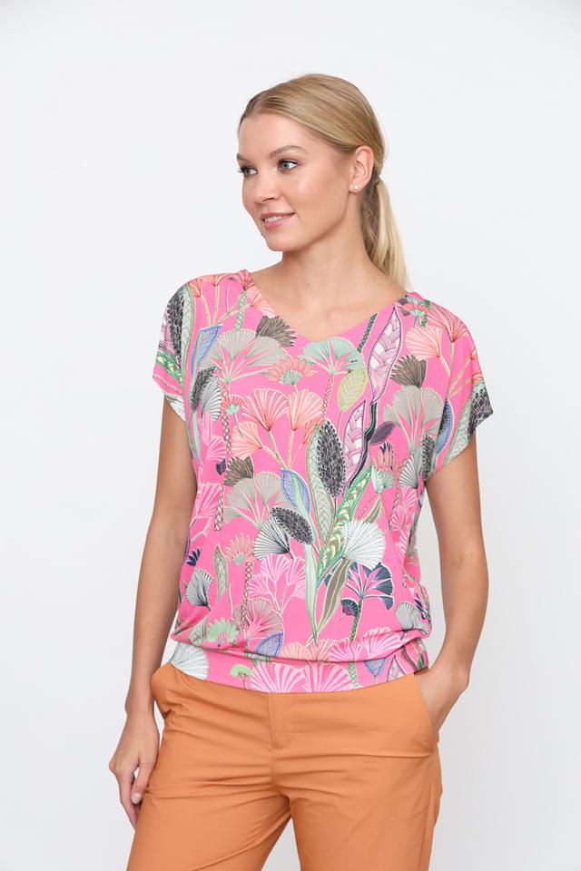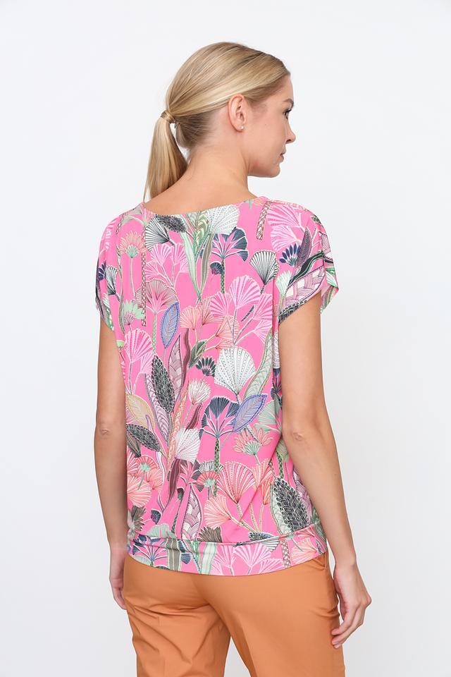 Основной цвет блузы – насыщенный розовый, который служит идеальным фоном для красочного тропического принта. Принт включает в себя изображения различных листьев и цветов, выполненных в зелёных, жёлтых и коричневых тонах.