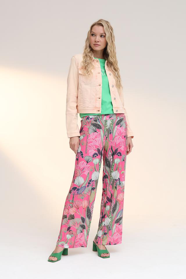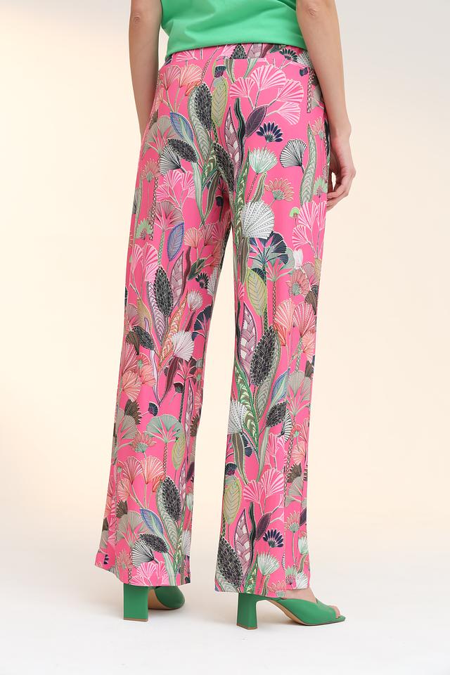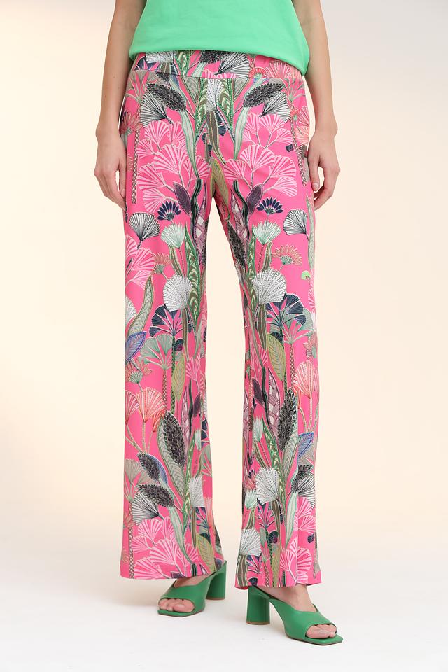 Эти брюки от Bianca – отличный выбор для создания яркого и запоминающегося образа. Брюки выполнены в насыщенном розовом цвете и украшены крупным, детализированным цветочным принтом, включающим в себя различные оттенки зелёного, синего и фиолетового.