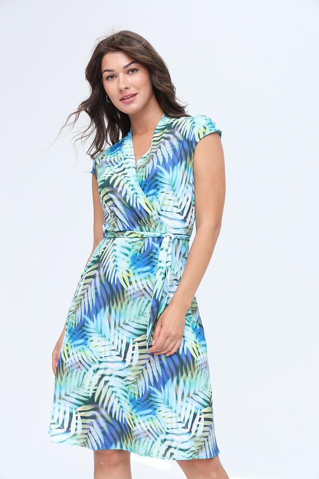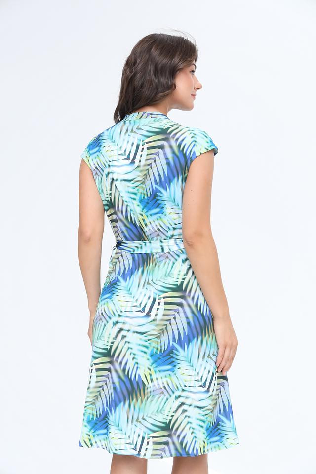 Платье имеет яркий и привлекательный тропический принт с изображением пальмовых листьев в различных оттенках зеленого и голубого. V-образный вырез и короткие рукава придают платью женственность и легкость. Модель с запахом и поясом акцентирует внимание на талии, создавая элегантный силуэт.