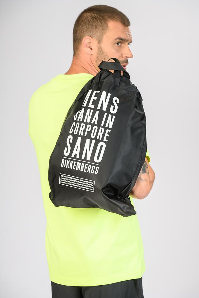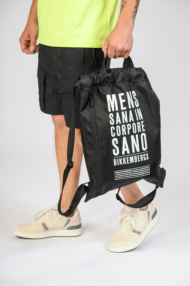 Сумка имеет классический чёрный цвет и украшена крупным белым принтом с надписью "MENS SANA IN CORPORE SANO" и логотипом бренда. Это латинское выражение означает "В здоровом теле здоровый дух".