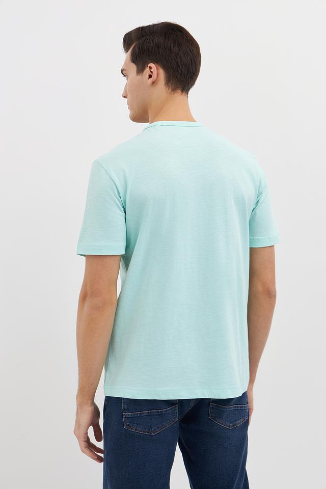 Цвет футболки – нежный мятный, который легко сочетается с различными элементами гардероба. На груди расположена небольшая вышивка с логотипом бренда, добавляющая изысканности. Круглый вырез горловины и короткие рукава делают эту футболку идеальной для теплой погоды.
