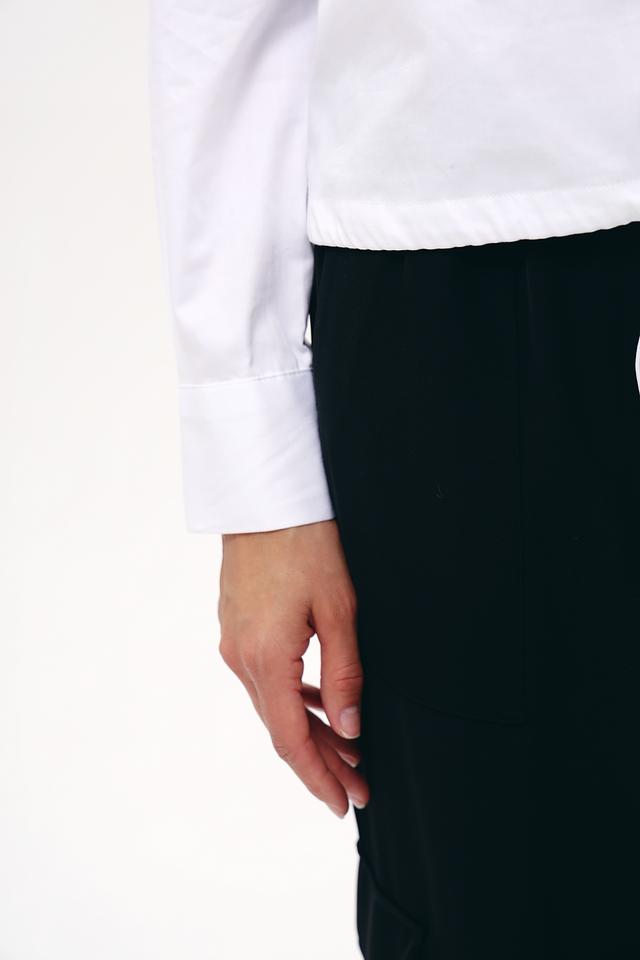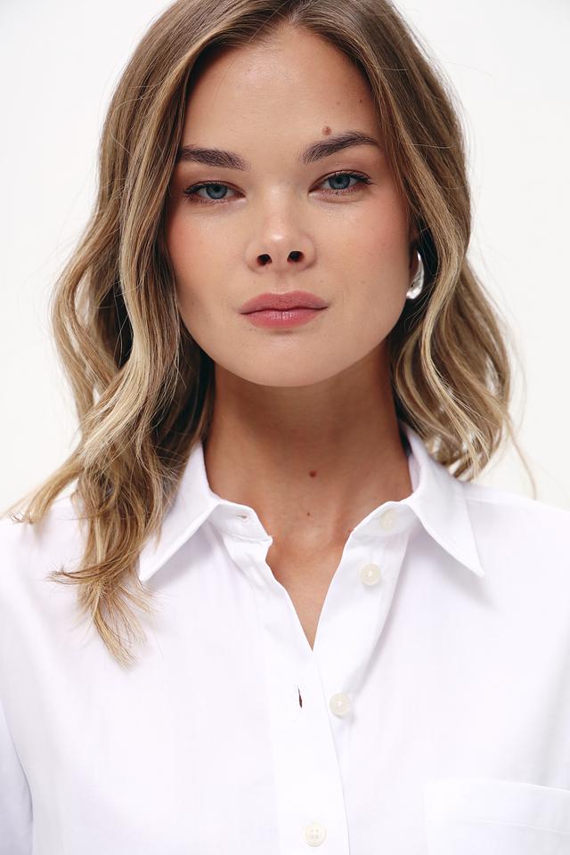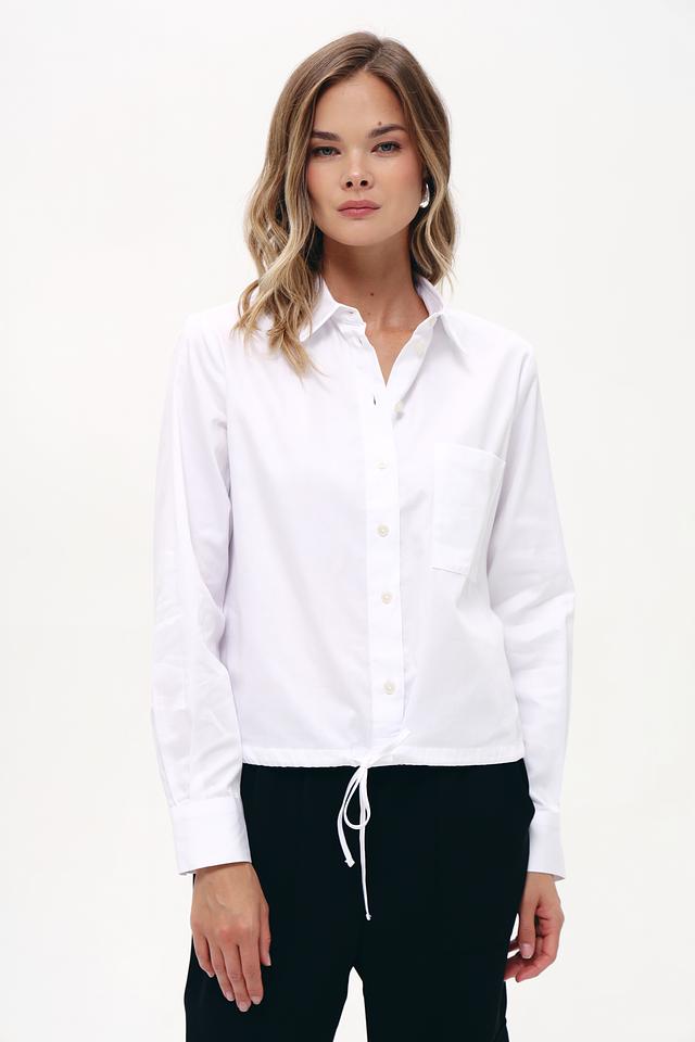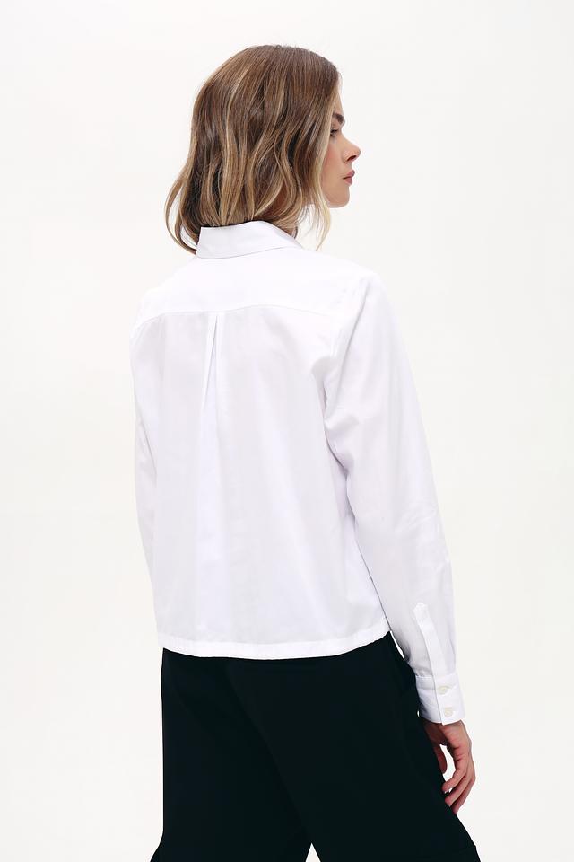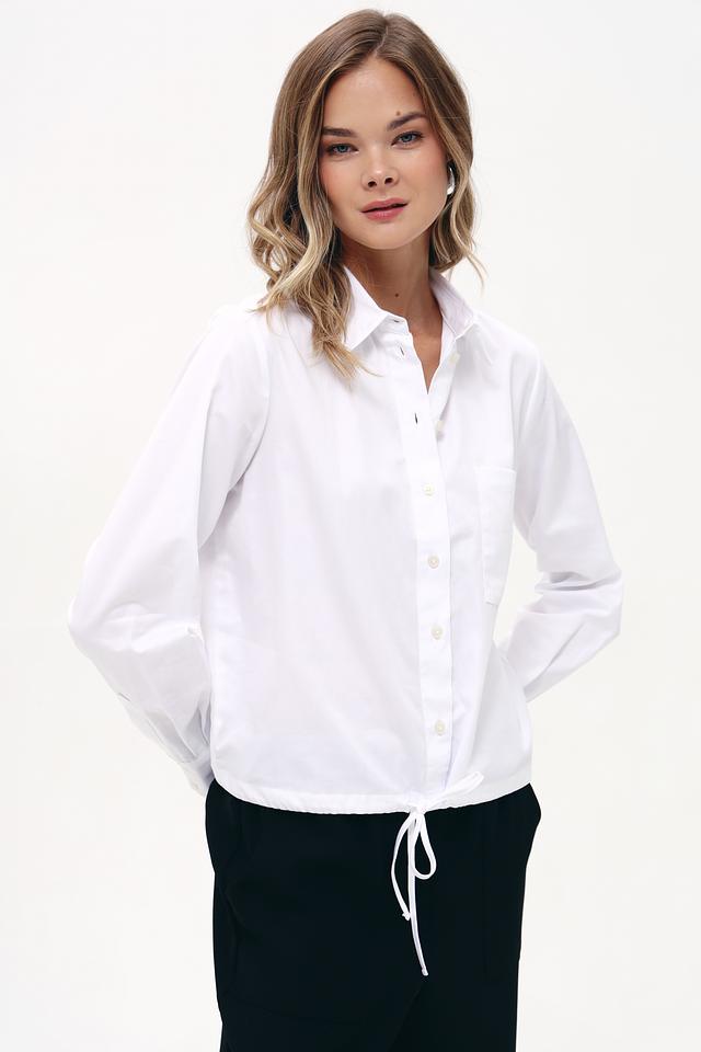 Блуза имеет приталенный силуэт, который подчеркивает фигуру, и длинные рукава с манжетами на пуговицах. Застежка на пуговицах по всей длине переда добавляет классический вид. Небольшой нагрудный карман добавляет функциональности и стиля.