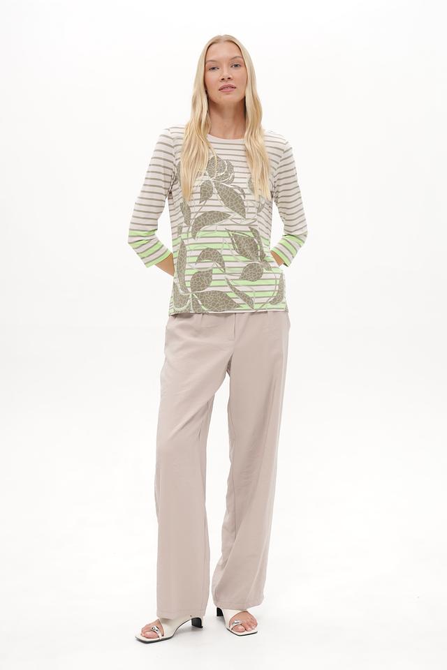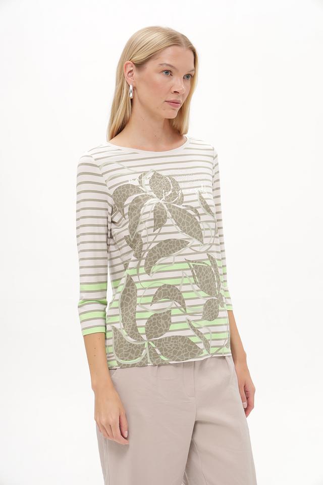 Основной цвет блузки – светло-серый, дополненный полосками и крупным принтом в виде листьев светло-зелёного и серого оттенков. Круглый вырез горловины и короткие рукава делают эту модель идеальной для тёплой погоды.