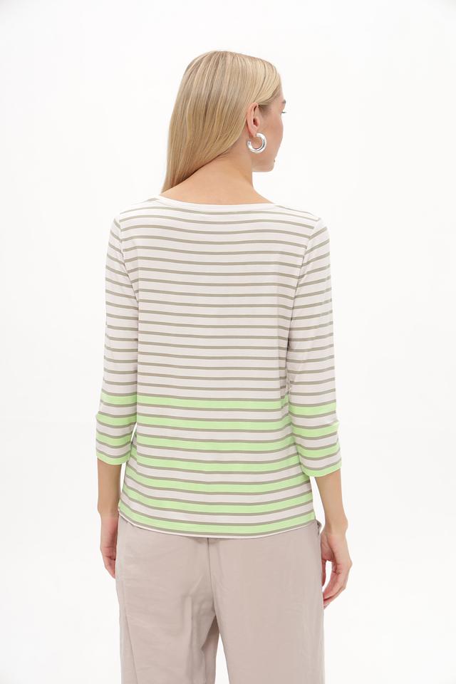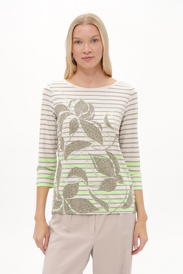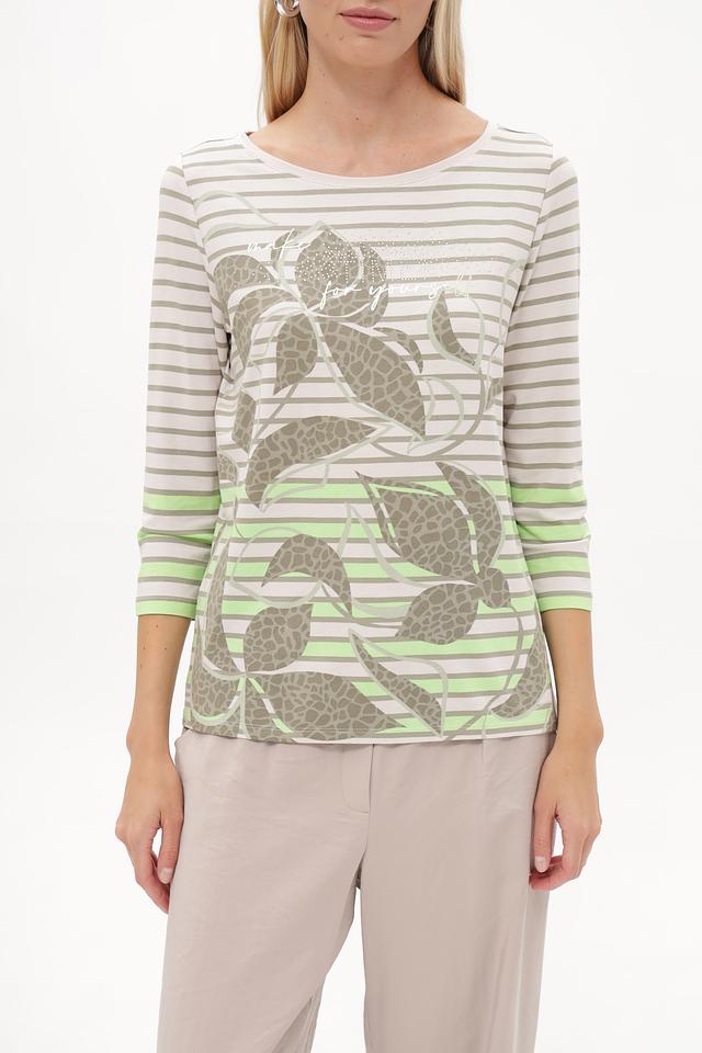 Блузка Betty Barclay светло-зелёного цвета с оригинальным принтом в виде листьев и полосок. Модель выполнена из мягкой вискозы с добавлением эластана, что обеспечивает комфорт в носке и хорошую посадку по фигуре. Состав: вискоза 95%, эластан 5%