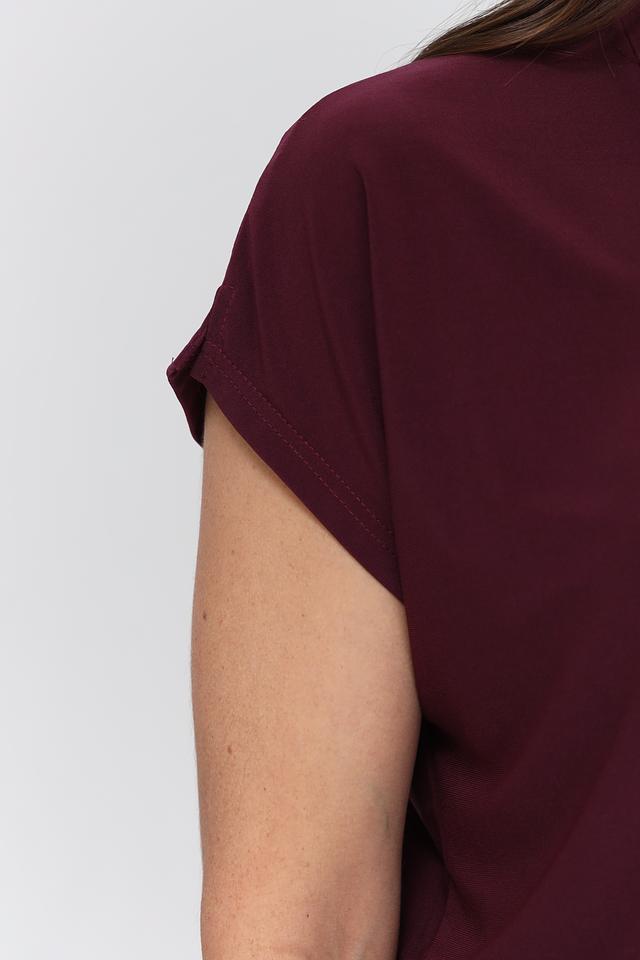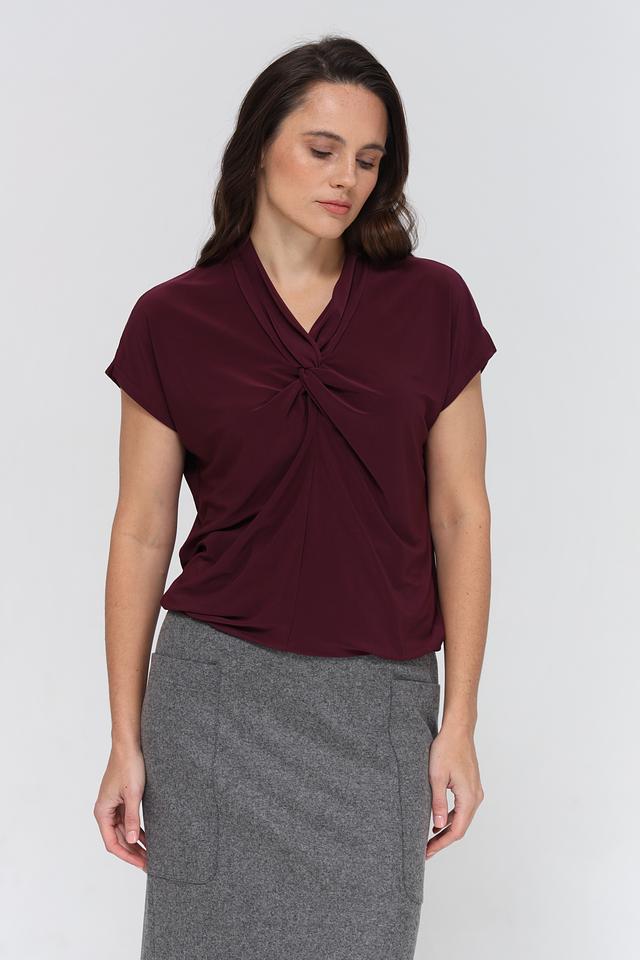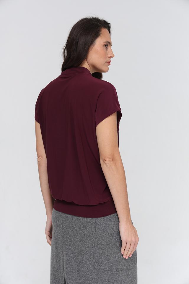 Бордовая блуза Bianca из полиэстера с элегантным запахом и V-образным вырезом. Изделие выполнено из мягкой ткани с добавлением эластана для комфорта и свободы движений. Состав: полиэстер 96%, эластан 4%