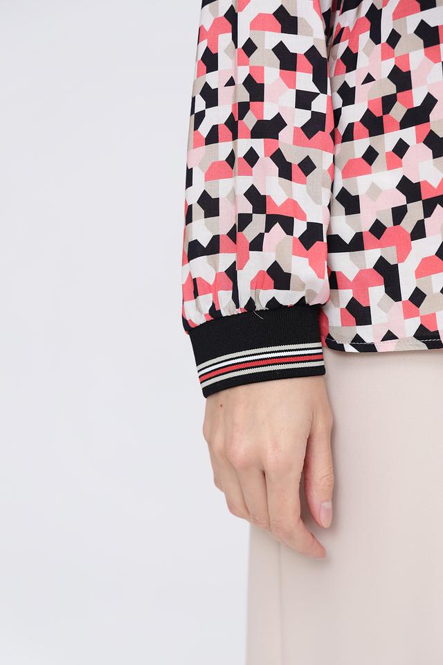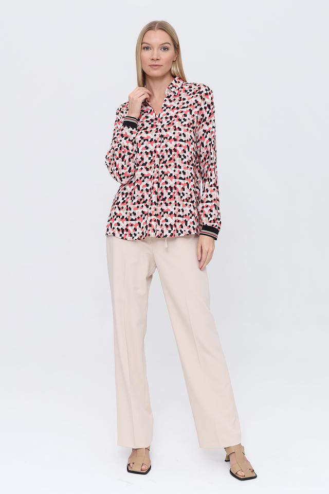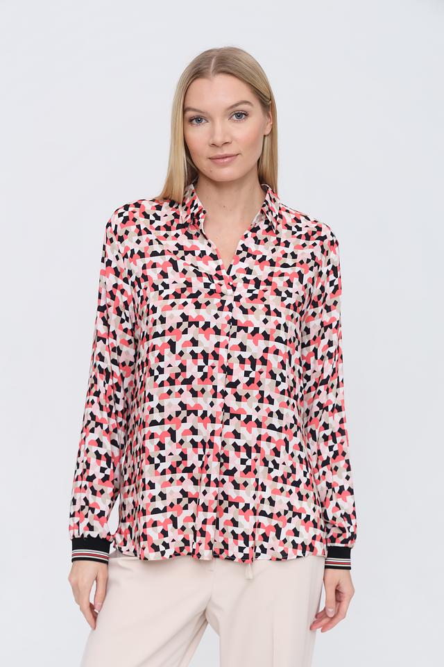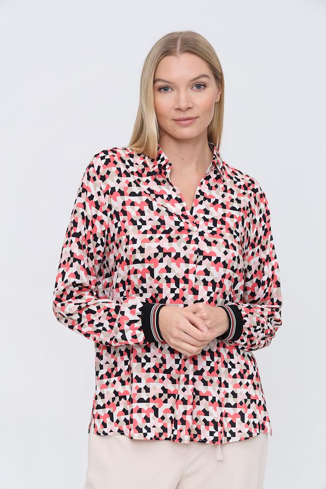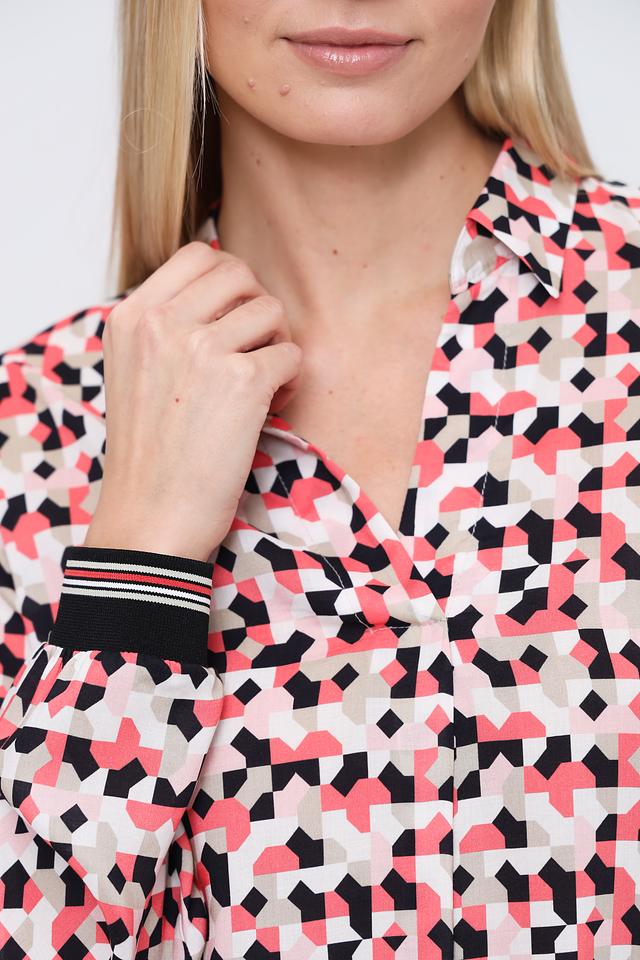 Особенностью данной модели является эффектный геометрический принт, сочетающий в себе оттенки розового, черного и белого. Такой рисунок делает блузу универсальной и подходящей для различных случаев – от повседневной носки до особых мероприятий.