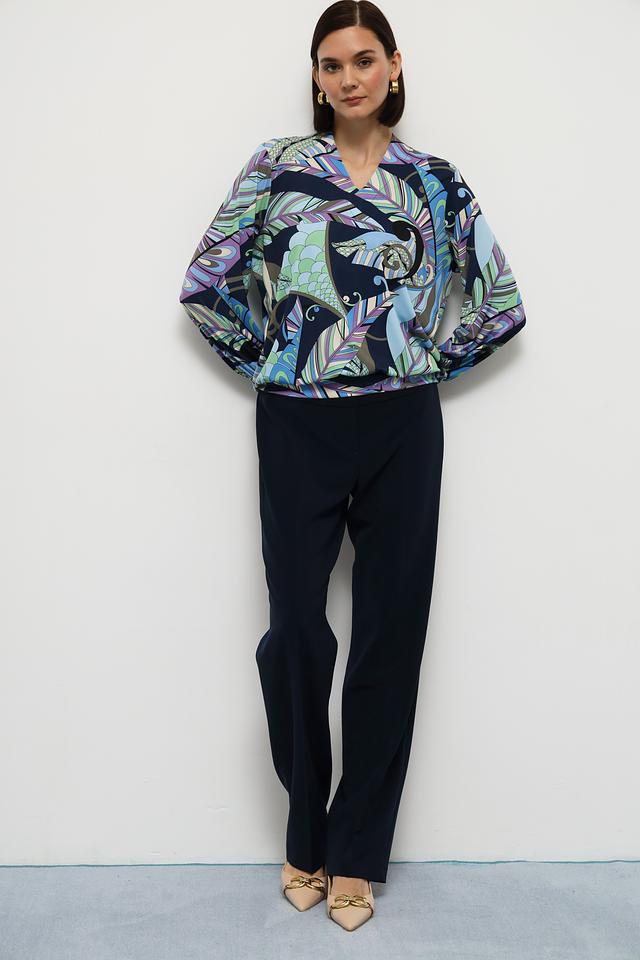Блуза имеет свободный крой и длинные рукава, что делает её универсальной для различных случаев. V-образный вырез горловины добавляет изящества, а оригинальный принт с абстрактными мотивами делает эту модель уникальной.