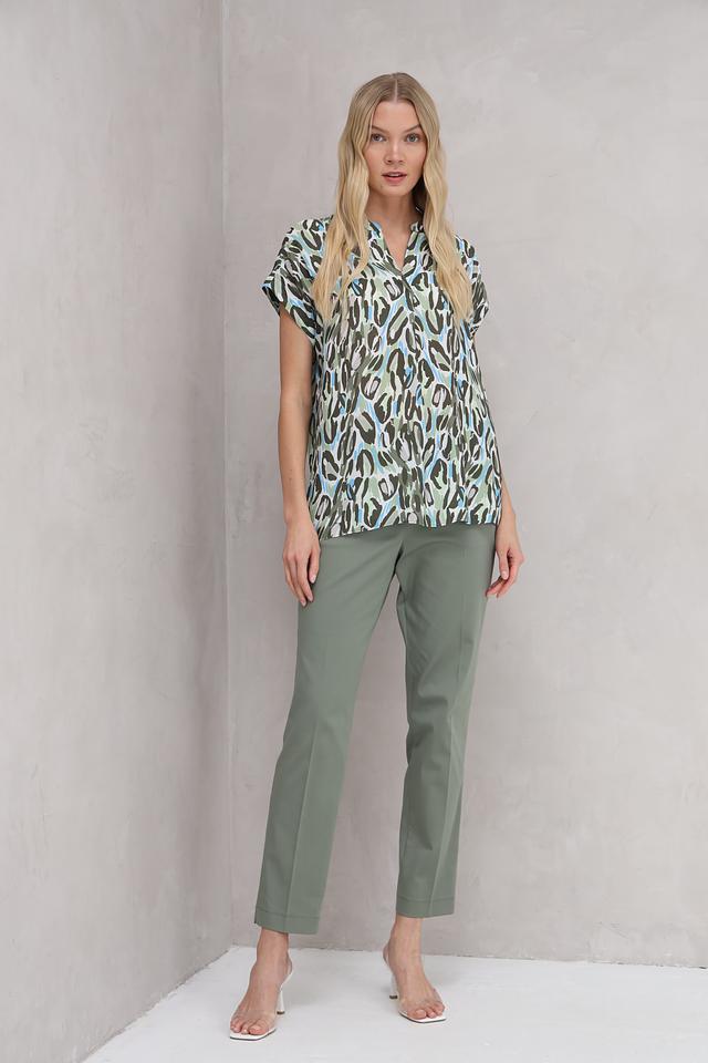 Особенностью этой блузы является ее уникальный леопардовый принт, выполненный в сочетании зеленых и голубых оттенков. Этот принт добавит вашему образу оригинальности и неповторимости. Блуза идеально сочетается с брюками, юбками и джинсами, позволяя создавать разнообразные стильные образы.