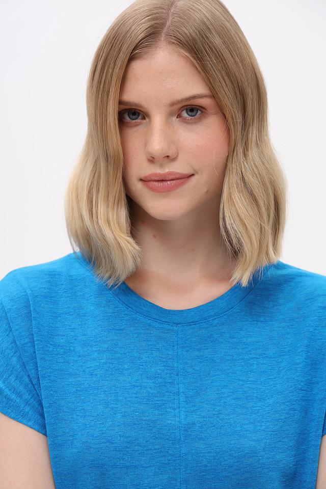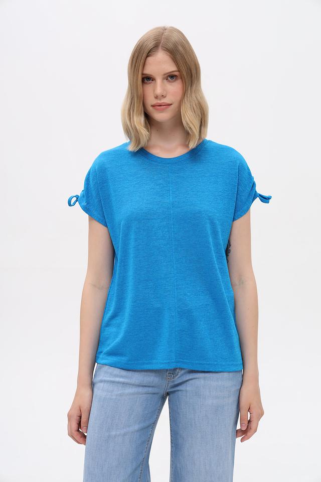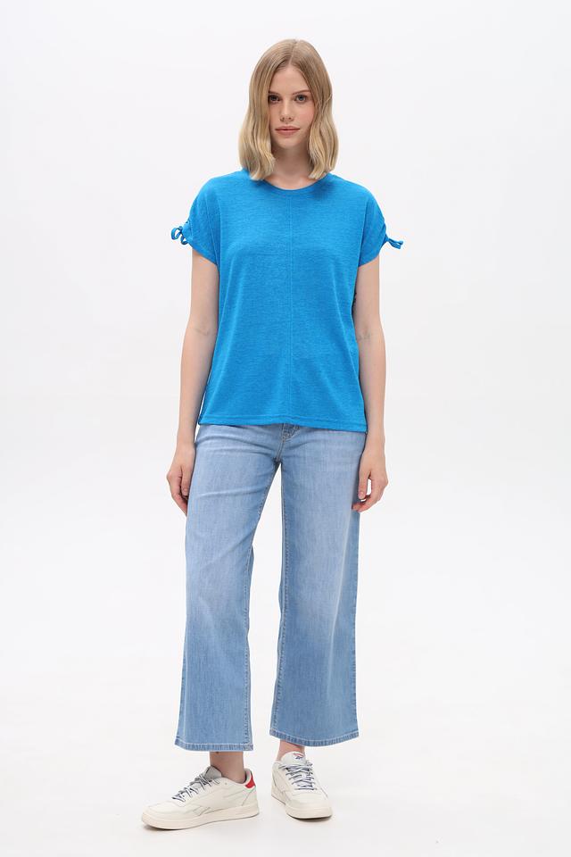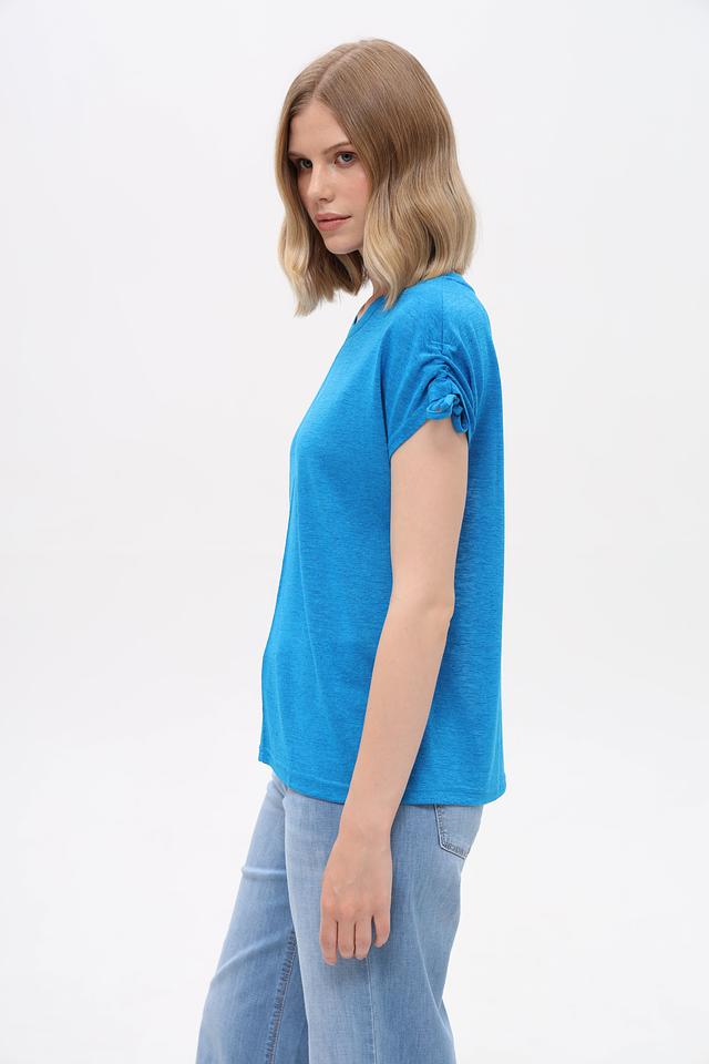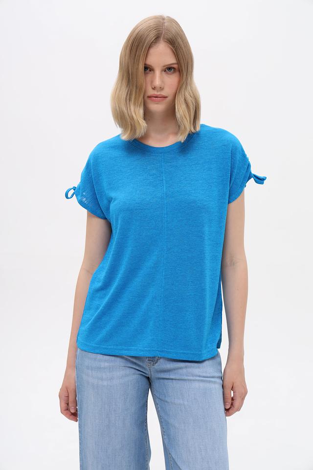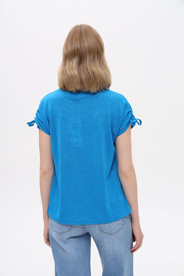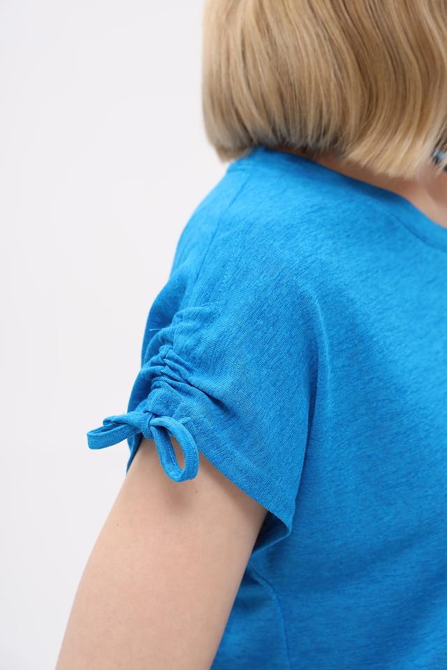 Блузка имеет короткий рукав, дополненный аккуратными завязками, которые позволяют регулировать объем и создавать различные образы. Круглый вырез горловины подчеркивает естественность и легкость силуэта.