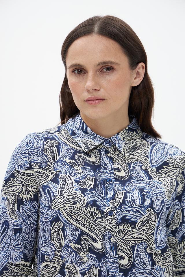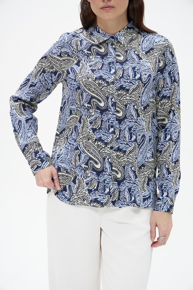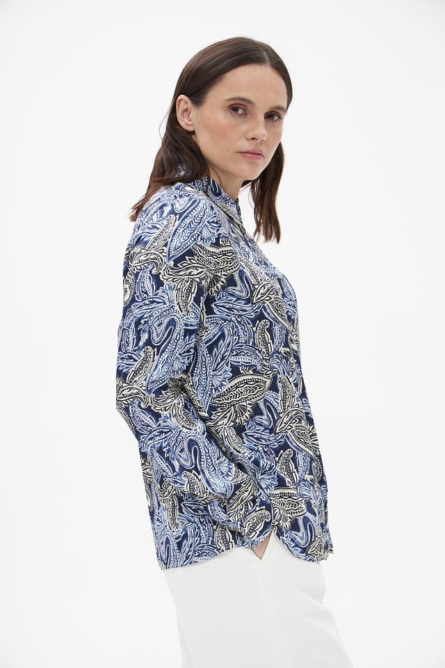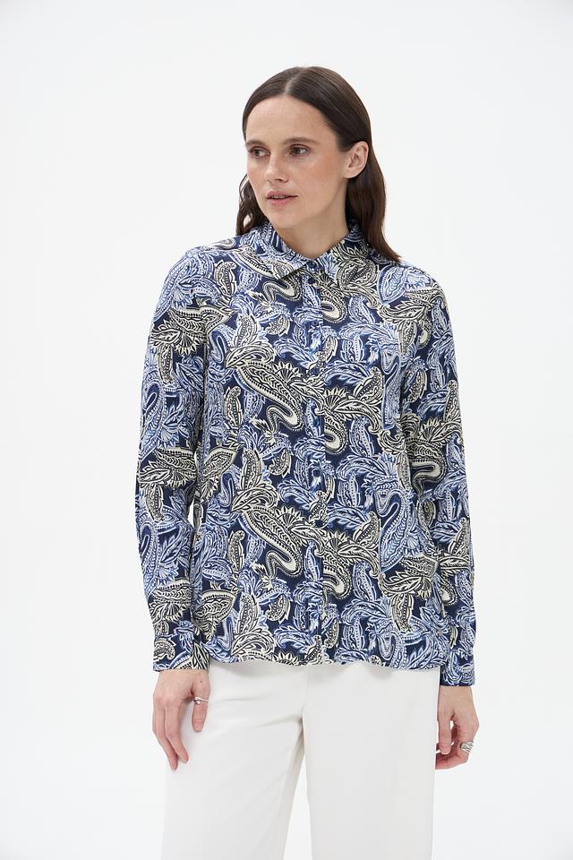Блузка имеет классический силуэт с длинными рукавами и воротником-стойкой. Главной особенностью модели является яркий и запоминающийся узор пейсли, выполненный в синих, бежевых и голубых тонах. Этот принт добавляет блузке изысканности и оригинальности.