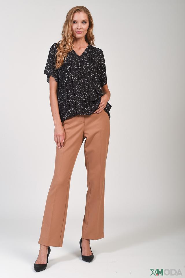 Блуза имеет V-образный вырез и короткие рукава, что делает её идеальной для тёплой погоды. Свободный крой обеспечивает комфорт и свободу движений. Ткань с лёгкой текстурой и сборками добавляет блузе объём и оригинальность.