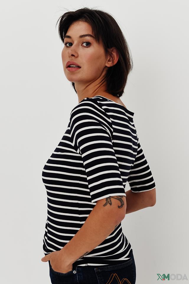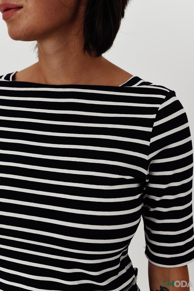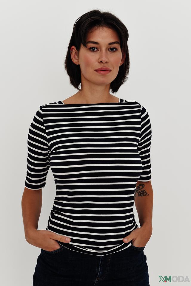 Блуза Comma чёрно-белого цвета с коротким рукавом и округлым вырезом. Модель выполнена в классическую полоску, что делает её универсальным элементом гардероба. Изготовлена из мягкой вискозы с добавлением эластана. Состав: вискоза 92%, эластан 8%