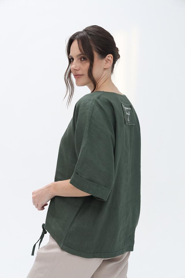 Зелёная блуза Electra style из льна и вискозы – это стильное и комфортное решение для создания повседневного образа. Свободный крой и короткие рукава обеспечивают удобство, а завязки по бокам добавляют оригинальности. Состав: лен 100%, вискоза 48%