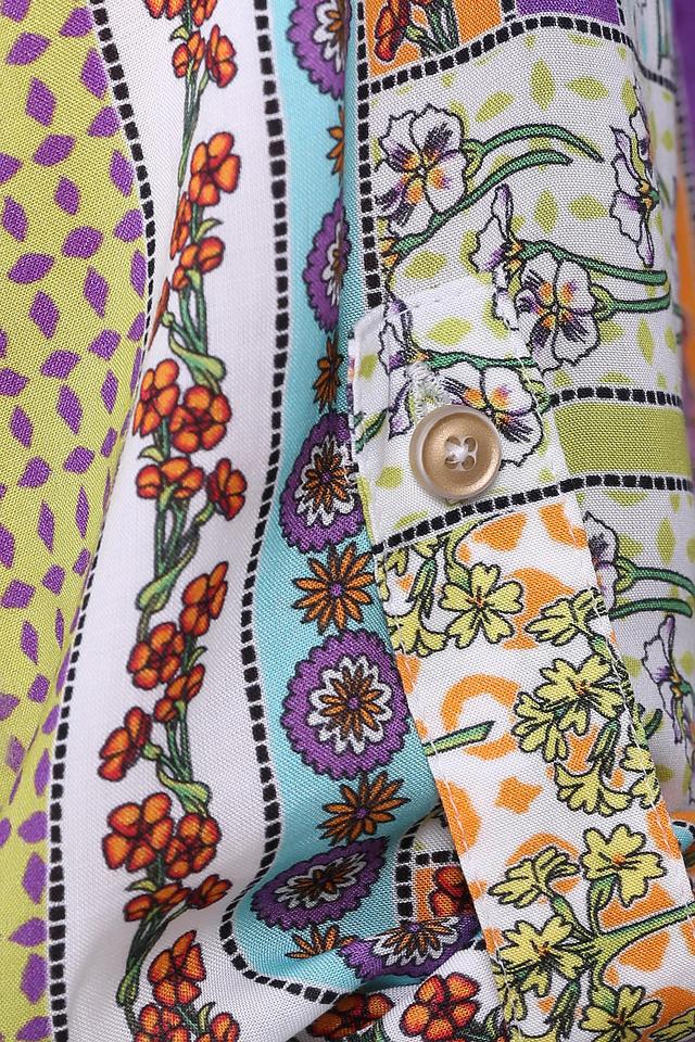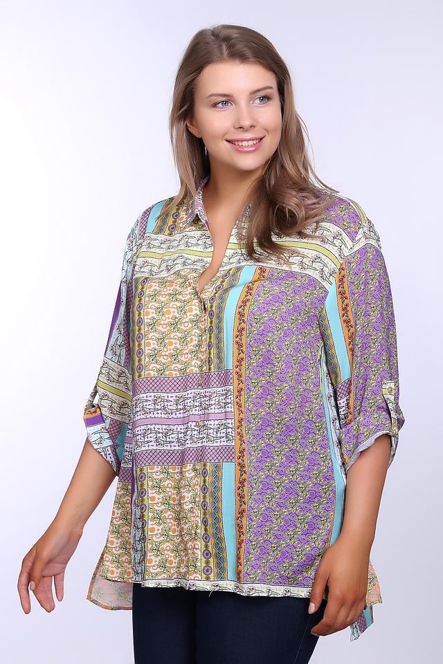 Блуза с оригинальным принтом в стиле пэчворк добавит красок и свежести в ваш образ. Рукава 3/4 с возможностью фиксации на пуговицу позволяют регулировать длину и создавать различные стили. Универсальный крой подойдет для любого типа фигуры, скрывая недостатки и подчеркивая достоинства.