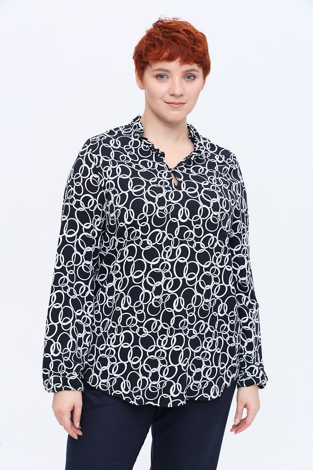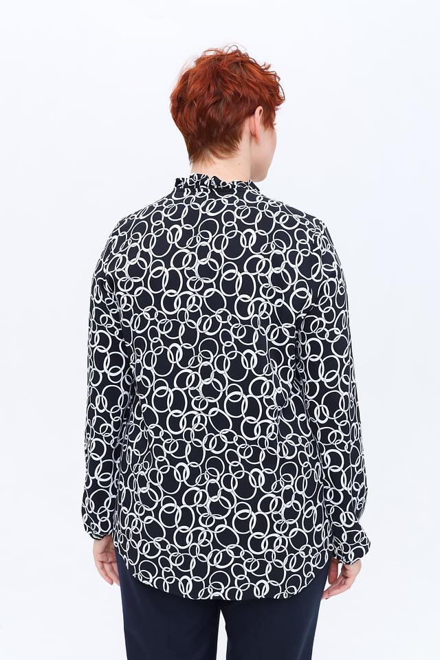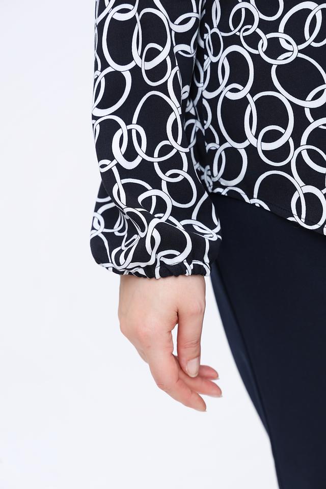 Основной цвет блузы – чёрный, а её особенностью является яркий геометрический принт из белых полос, создающий динамичный и современный образ. V-образный вырез горловины дополнен аккуратной сборкой, придающей блузе изящность.