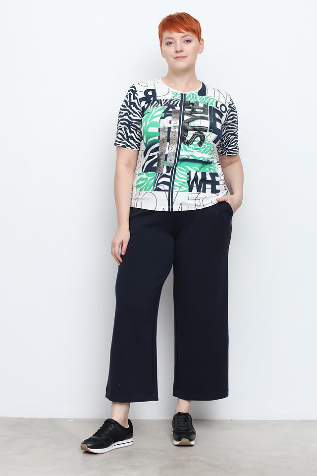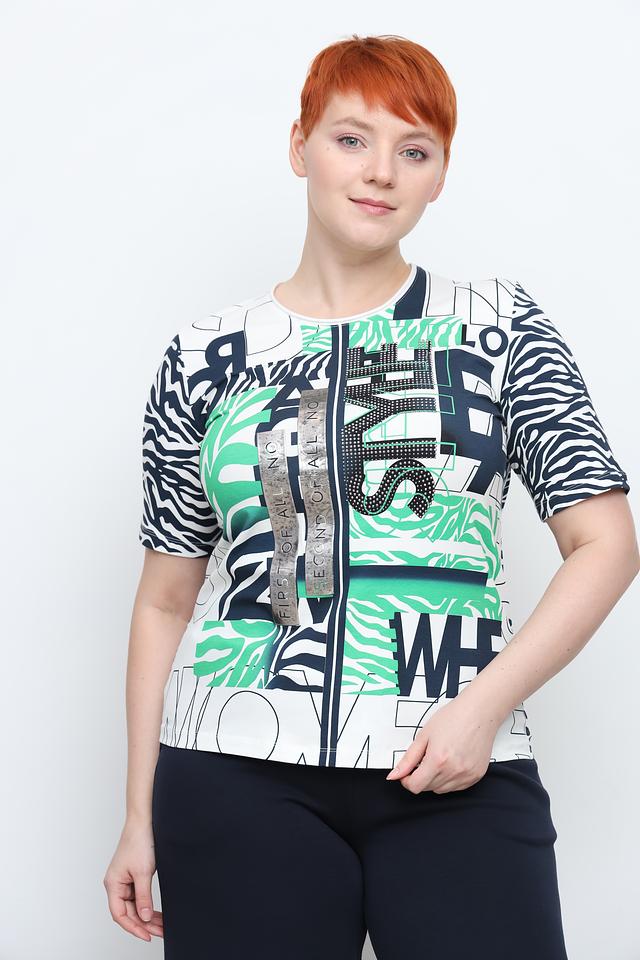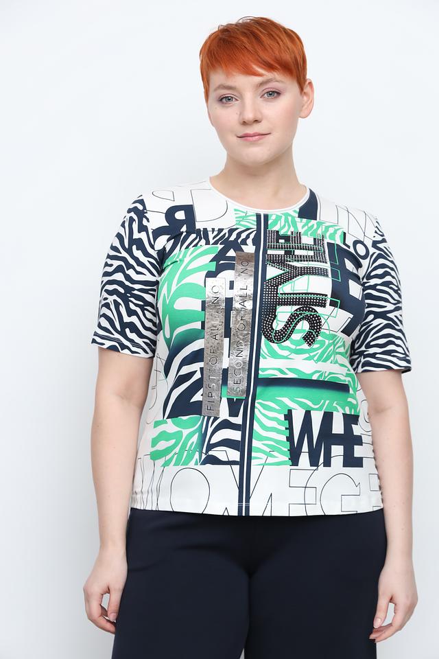 Эта блуза от Frank Walder – отличный выбор для создания яркого и запоминающегося образа. Блуза выполнена в белом цвете и украшена эффектным принтом, сочетающим в себе абстрактные элементы, зелёные полосы и имитацию зебры.