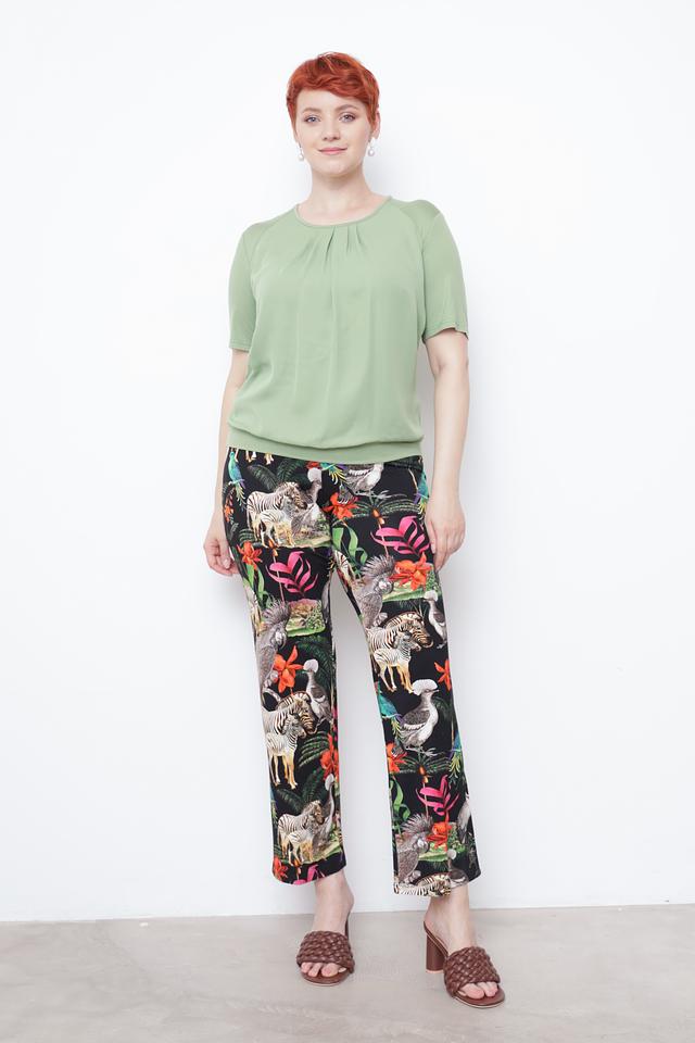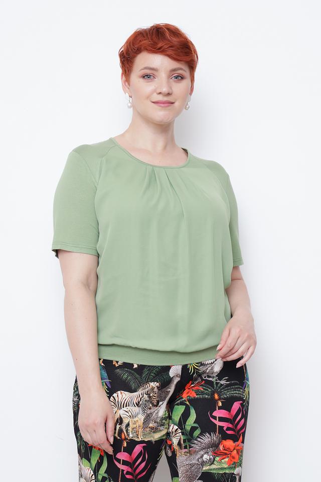 Модель имеет прямой крой, короткие рукава и округлый вырез горловины. Особое внимание привлекает декоративная сборка по центру переда, которая создает эффектный акцент и придает блузе изысканность.