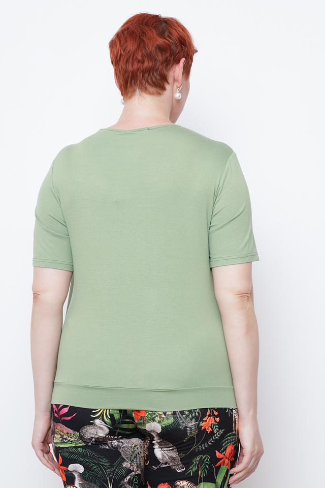 Оливковая блуза Frank Walder из вискозы с короткими рукавами и округлым вырезом. Модель имеет слегка спущенную линию плеч и декоративную сборку по центру переда, что придает ей элегантный и женственный вид. Блуза идеально подойдет для создания повседневных и офисных образов. Состав: вискоза 93%, эластан 7%