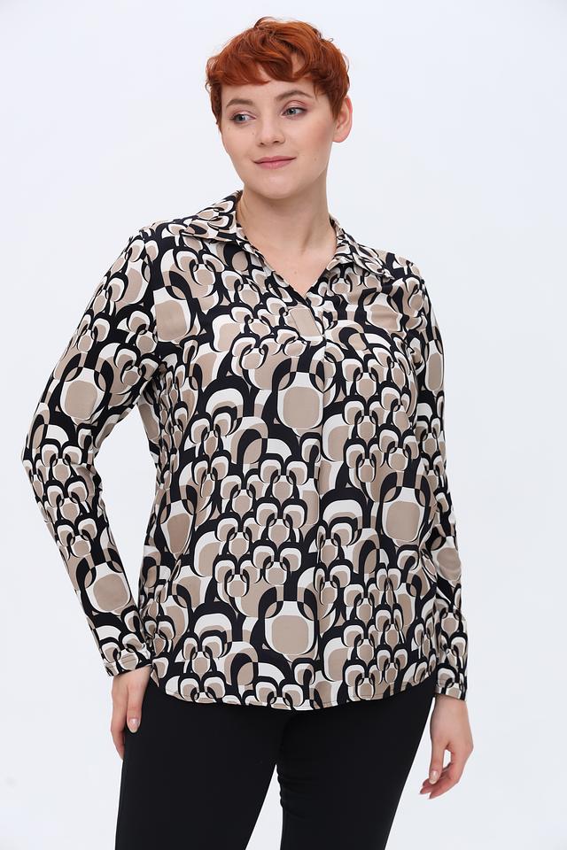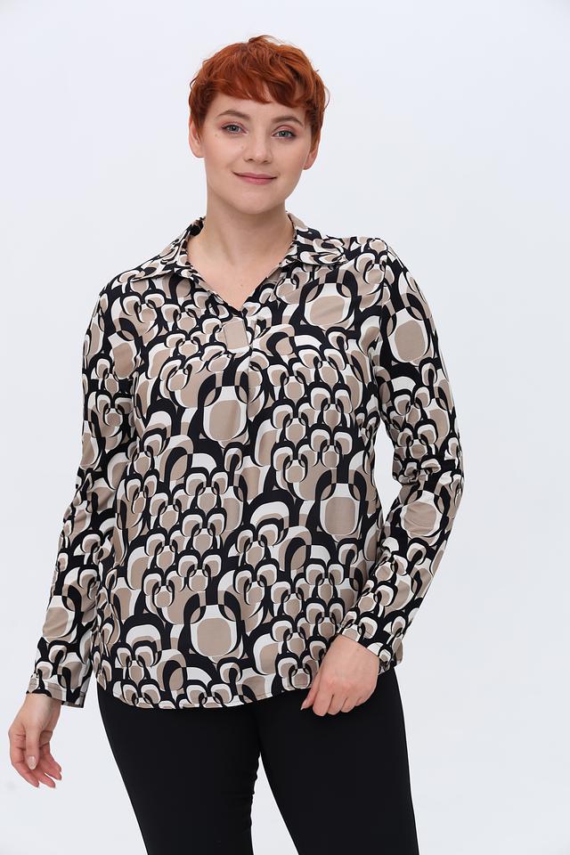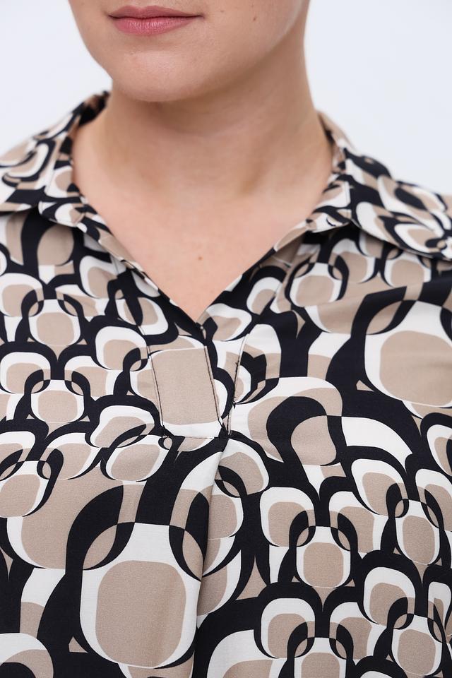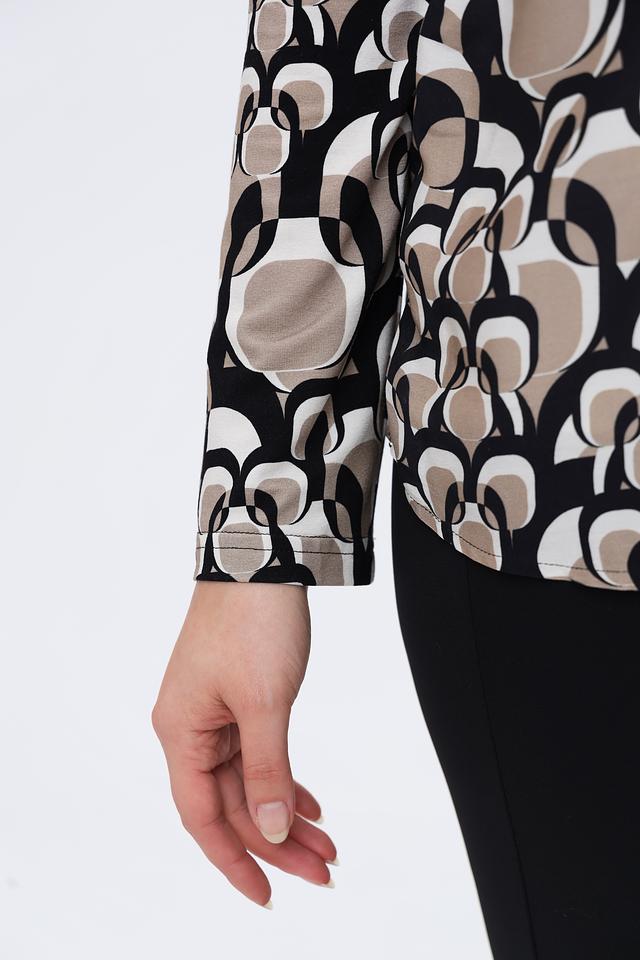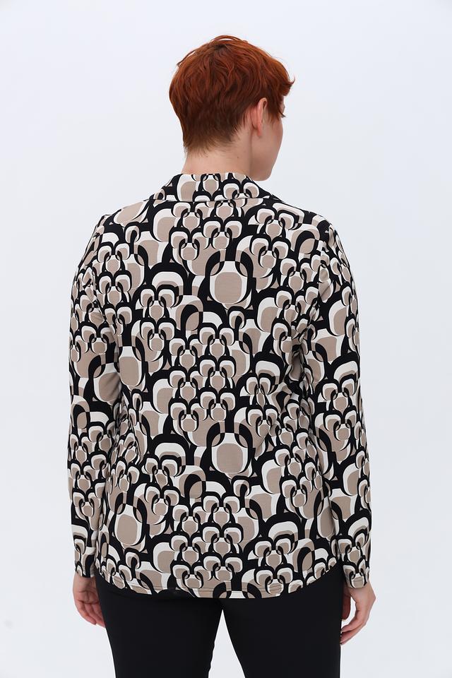 Блуза имеет классический крой с длинными рукавами и V-образным вырезом. Главная особенность модели – стильный геометрический принт в чёрно-бежевой гамме, который придаёт ей изысканность и оригинальность.