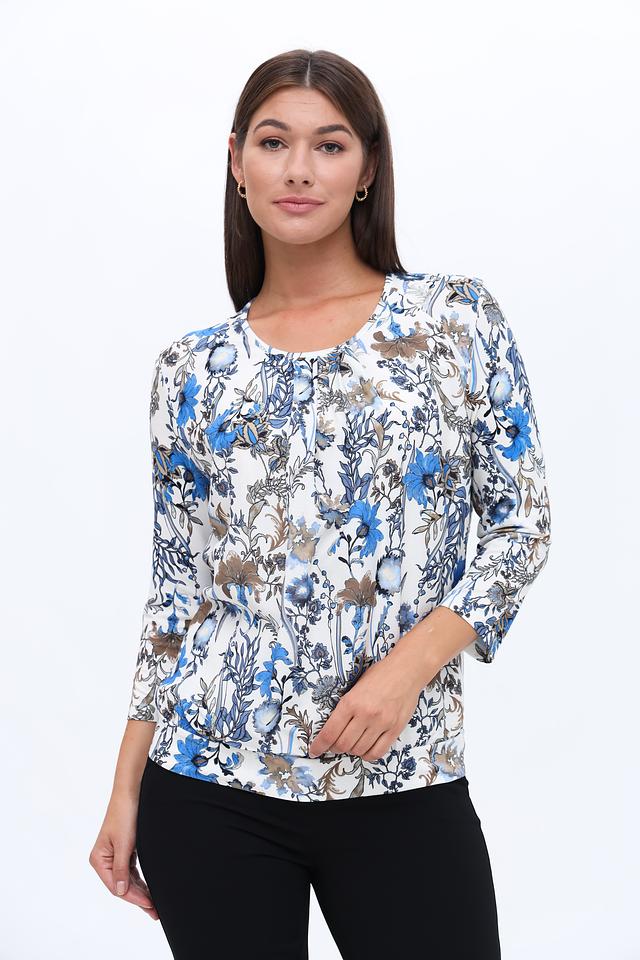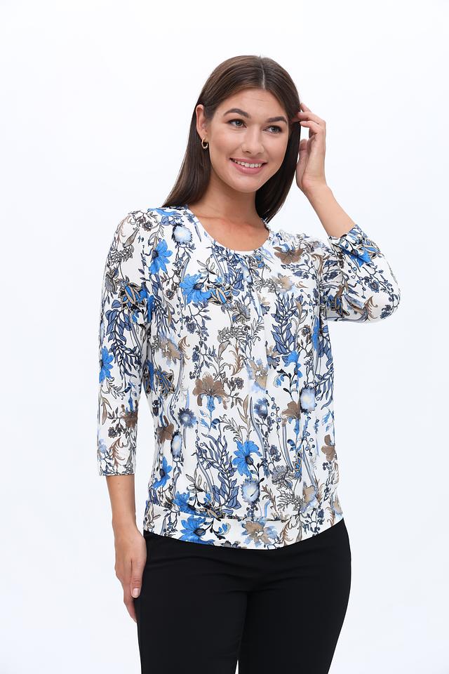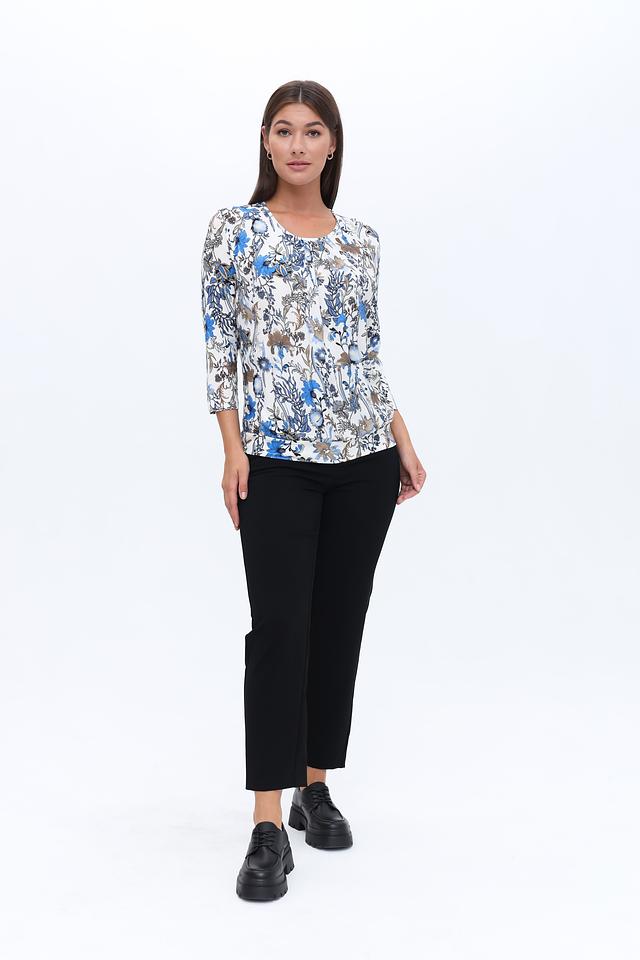Модель имеет округлый вырез горловины и рукава длиной три четверти, что делает ее универсальной для любого времени года. Блуза выполнена из высококачественной вискозы с добавлением эластана, благодаря чему она приятна к телу, хорошо драпируется и не мнется.