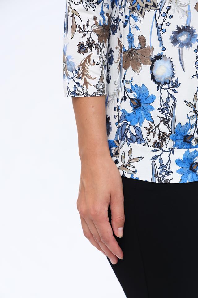 Эта стильная блуза от Frank Walder станет прекрасным выбором для создания элегантного и женственного образа. Блуза выполнена в белом цвете и украшена ярким цветочным принтом, сочетающим в себе оттенки синего, коричневого и бежевого.