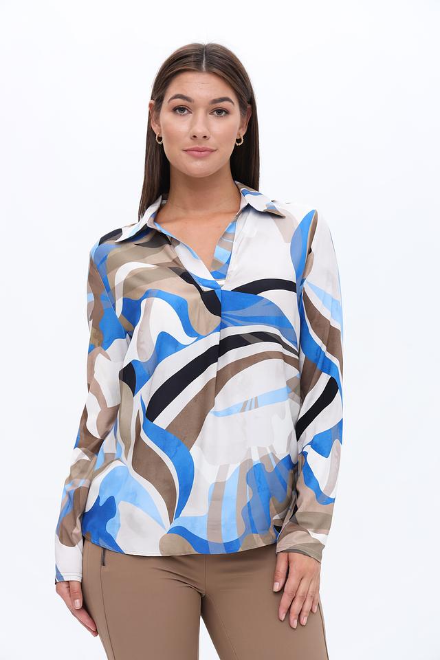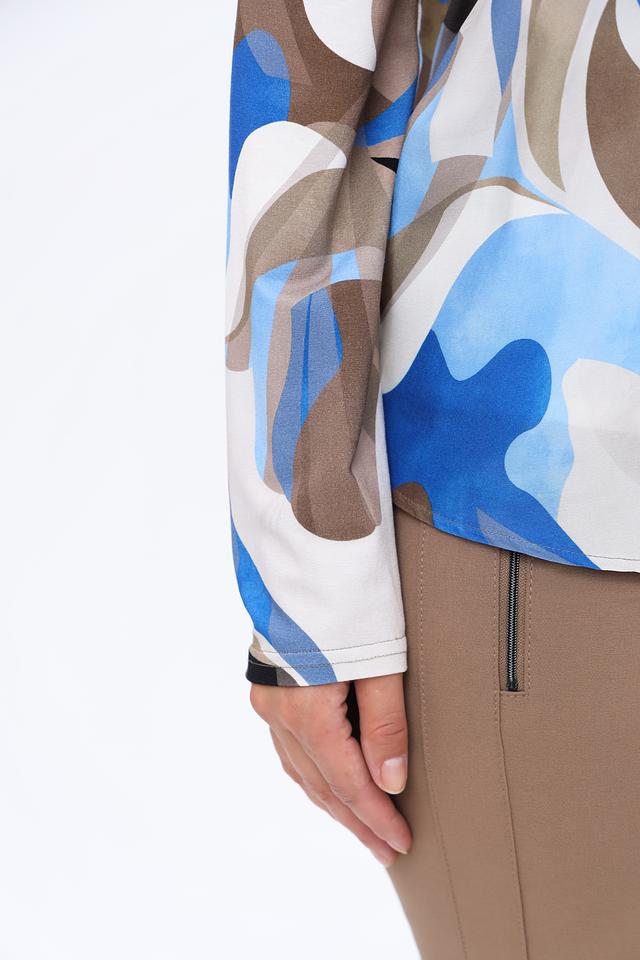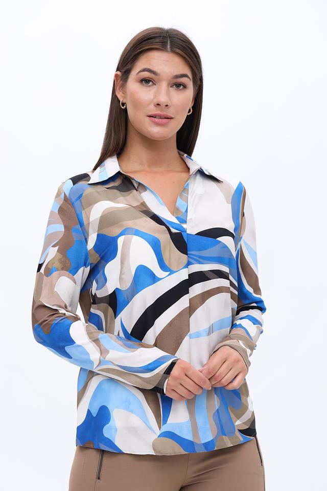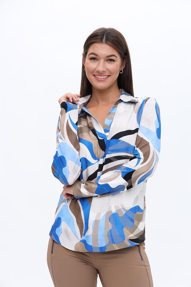 Блуза имеет классический крой с длинными рукавами и отложным воротником. Главная особенность модели – яркий абстрактный принт, сочетающий в себе оттенки синего, белого, коричневого и черного. Такой рисунок добавит образу оригинальности и индивидуальности.