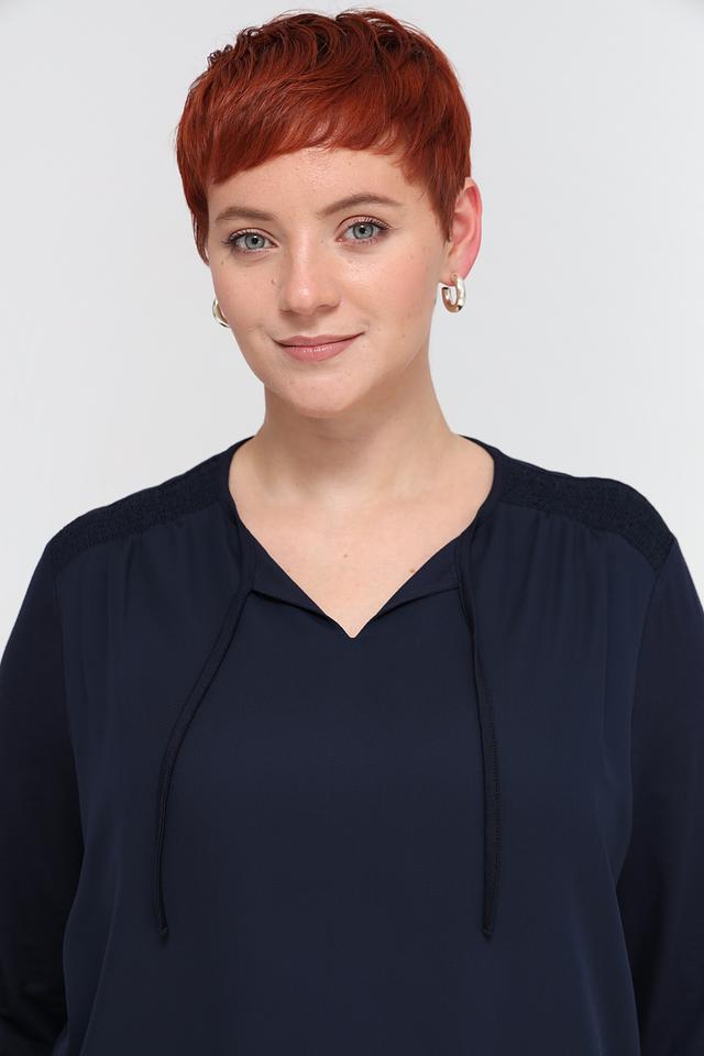 Темно-синяя блуза Frank Walder из вискозы с добавлением эластана. Модель имеет V-образный вырез, короткие рукава и декоративные завязки на горловине, которые придают образу женственность. Состав: вискоза 93%, эластан 7%