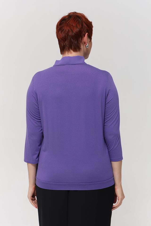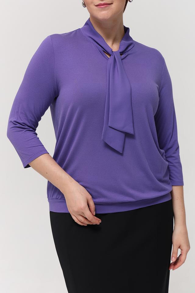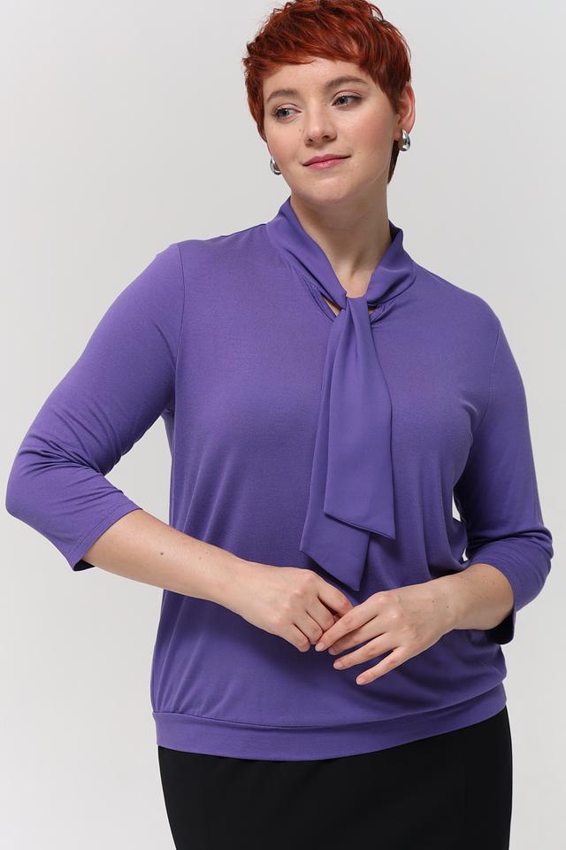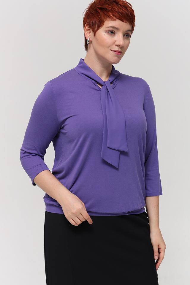 Блуза имеет лавандовый цвет и классический крой с рукавами длиной 3/4. Особый акцент сделан на воротнике, украшенном элегантным бантом, который придает образу женственность и изысканность.