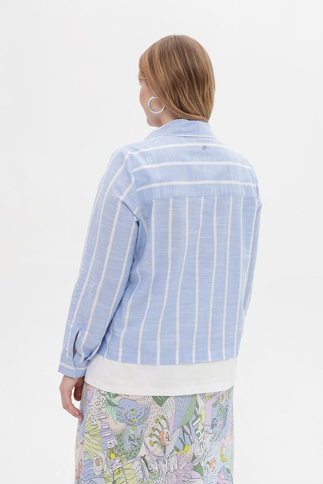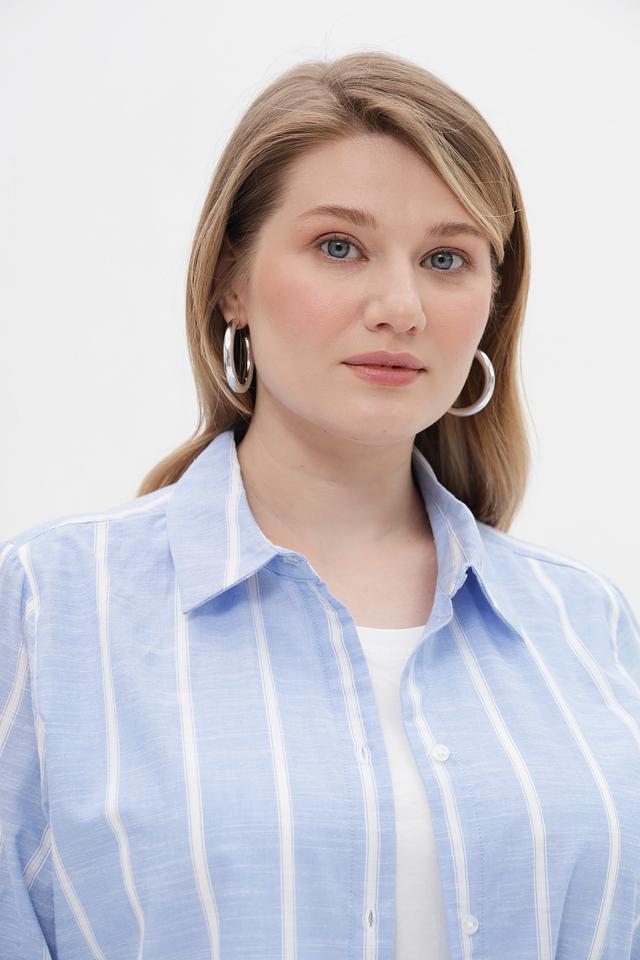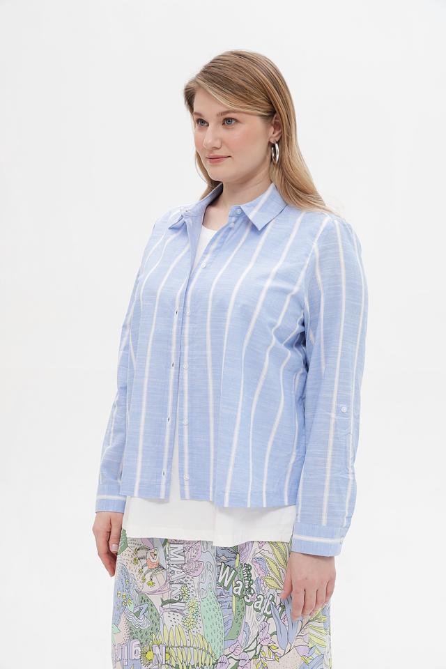 Голубая блузка Frapp в тонкую полоску выполнена из 100% хлопка. Классический крой с длинными рукавами и воротником придаст образу свежесть и легкость. Идеально сочетается с юбками и брюками. Состав: хлопок 100%