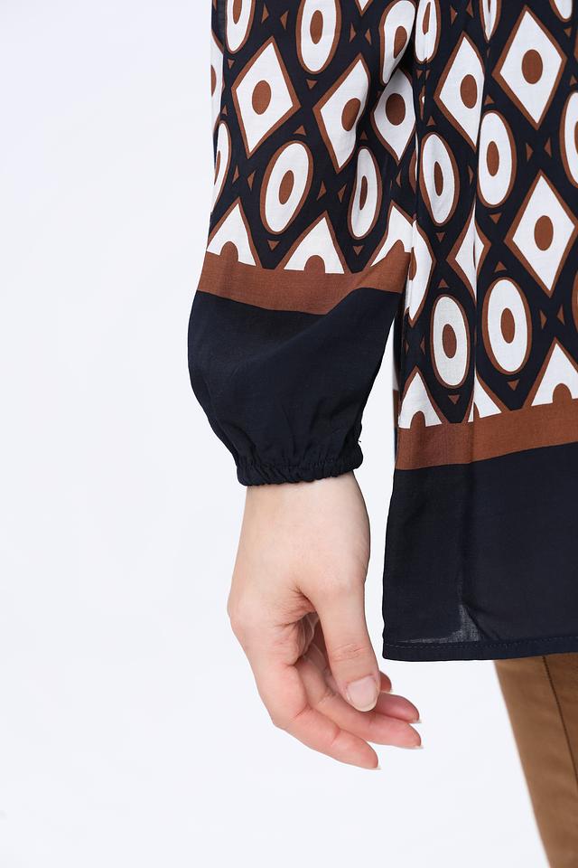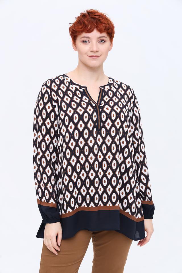 Эта блуза от Frapp – идеальный выбор для создания элегантного и комфортного образа. Выполнена в чёрно-белой гамме с ярким геометрическим принтом, который привлекает внимание и добавляет индивидуальности.