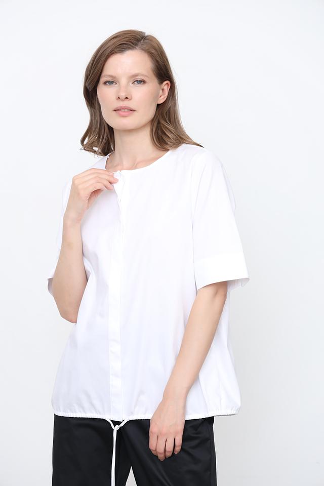 Модель отличается коротким рукавом и классическим воротником. Застежка на пуговицы по всей длине позволяет регулировать степень открытости. Сборка по низу блузы придает ей более женственный и легкий вид.