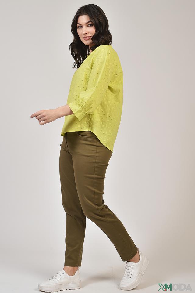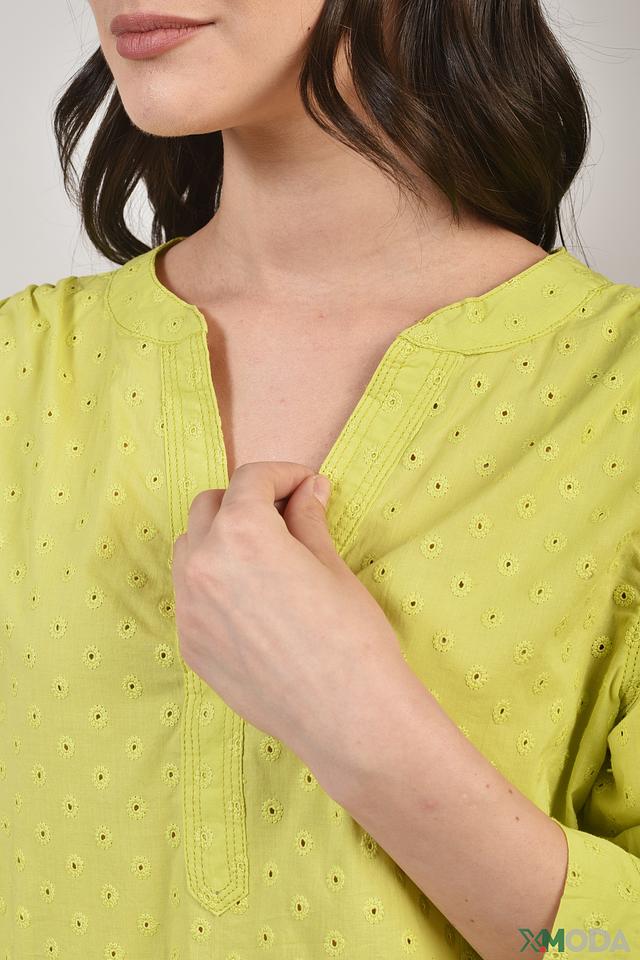 Лёгкая блуза Gerry Weber EDITION лаймового цвета выполнена из 100% хлопка с вышивкой "рисинка". Модель имеет V-образный вырез и рукава 3/4 с манжетами. Состав: хлопок 100%