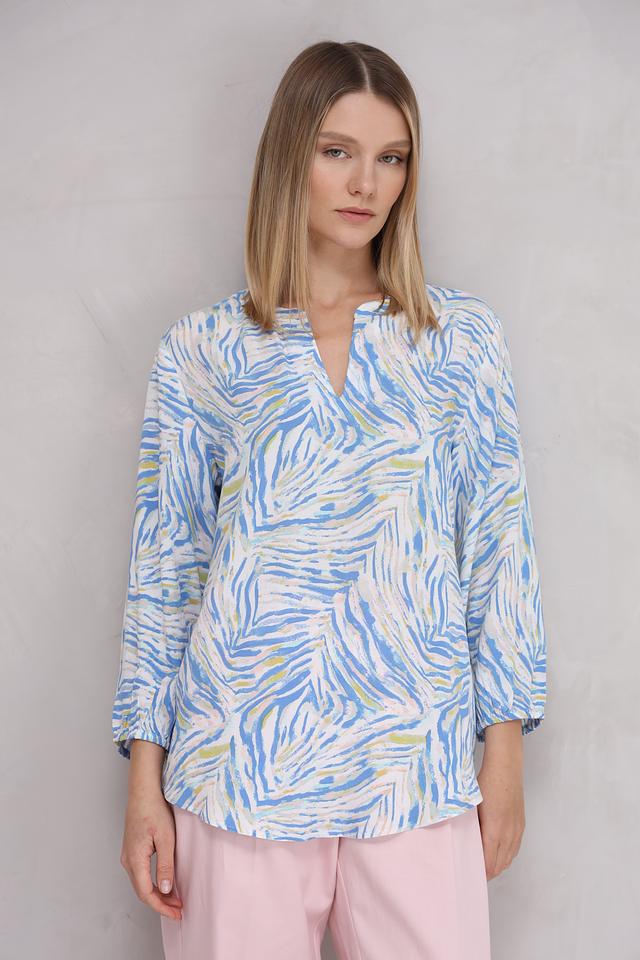Особенностью этой модели является яркий и оригинальный принт в голубых и зелёных тонах, который делает блузу уникальной и привлекательной. Она идеально сочетается с брюками, юбками и джинсами, позволяя создавать разнообразные стильные образы.