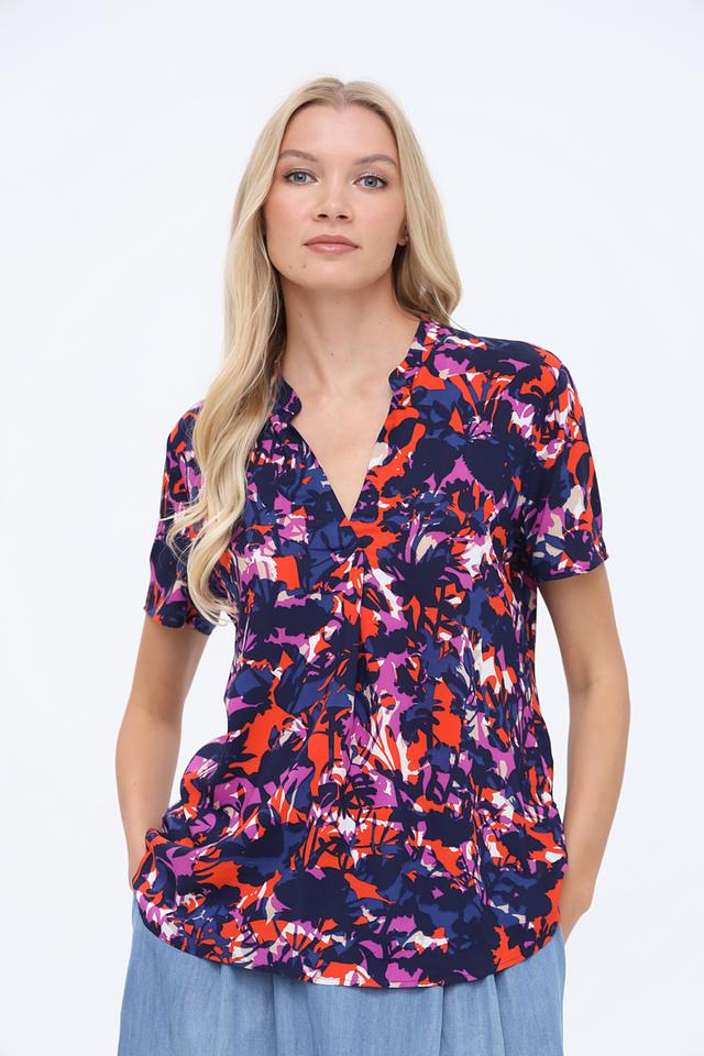 Основной цвет блузы – насыщенный синий, который служит прекрасным фоном для красочного цветочного принта. Принт включает в себя оттенки оранжевого, пурпурного и фиолетового, создавая эффектный и запоминающийся дизайн.