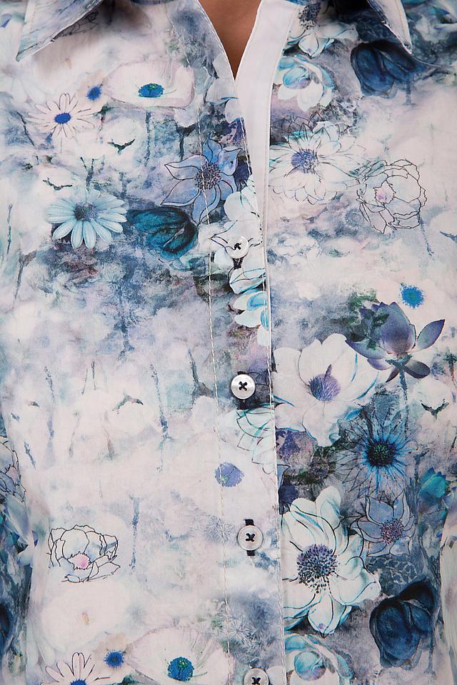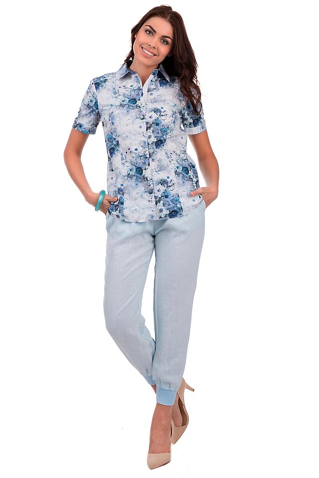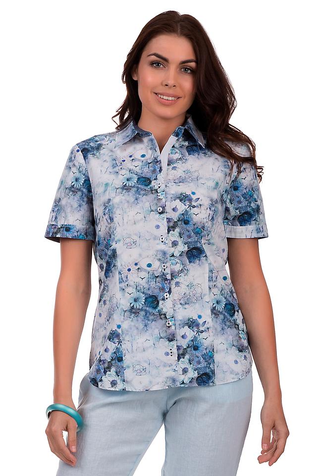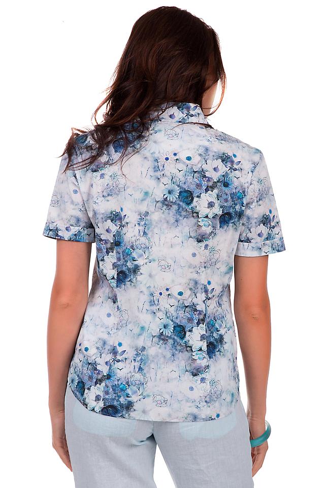 Особенностью данной модели является яркий цветочный принт в голубых и белых тонах. Классический крой с короткими рукавами и отложным воротником делает эту блузу универсальной и подходящей для различных типов фигур.