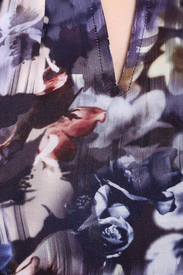 Основной цвет блузы – темно-синий, который служит прекрасным фоном для яркого цветочного принта. Принт состоит из различных оттенков синего, фиолетового, розового и белого, создавая эффектный и запоминающийся дизайн.