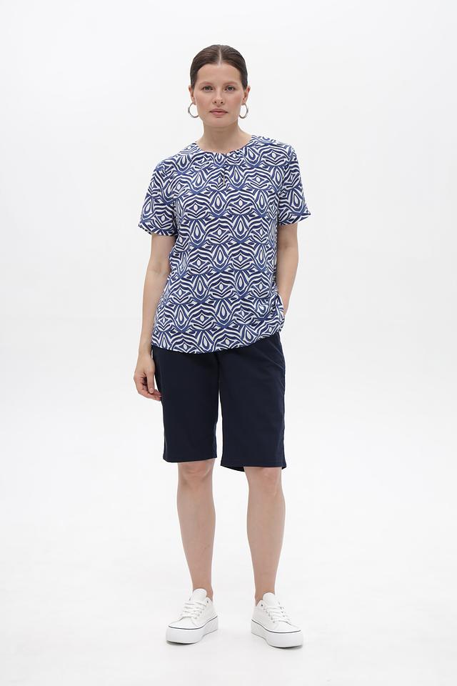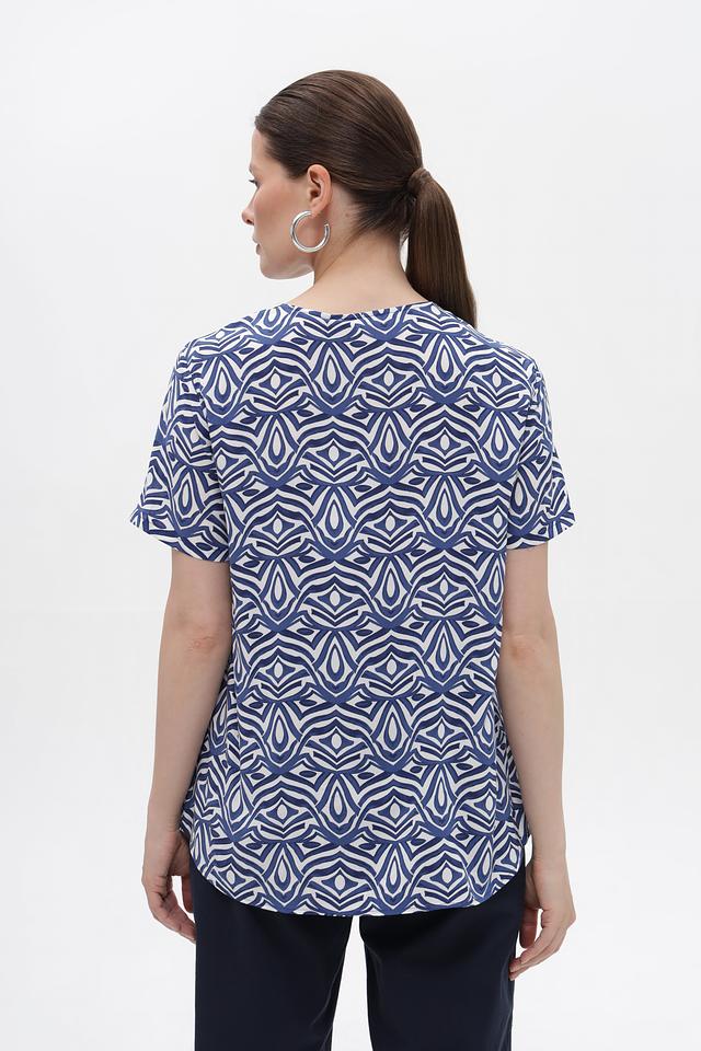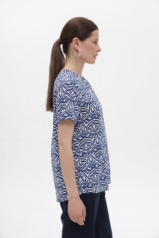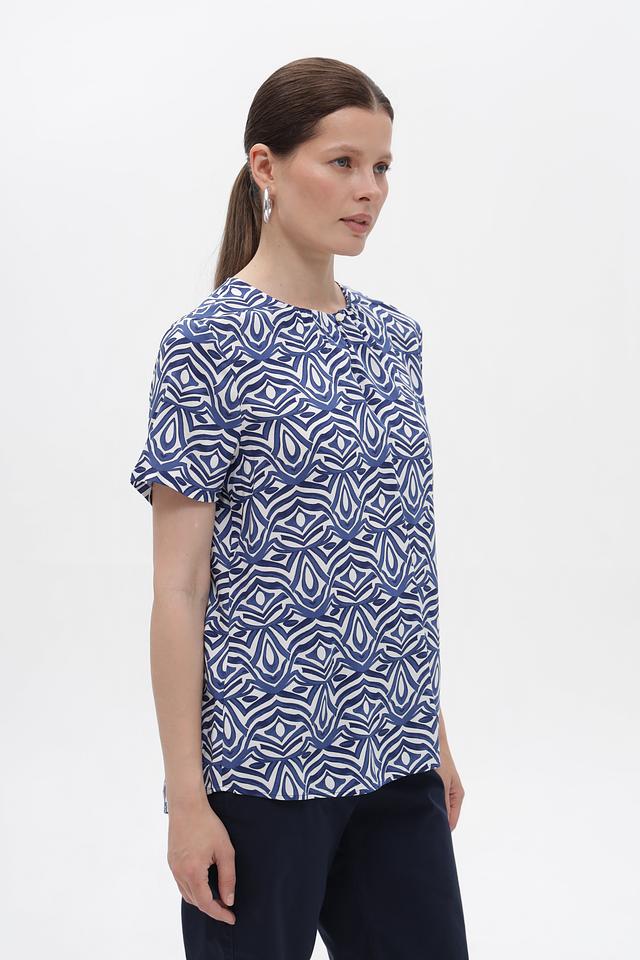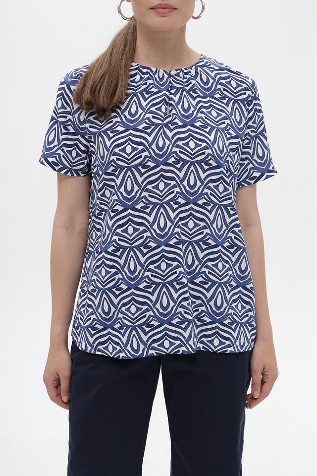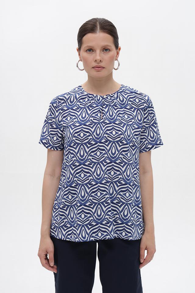 Особенностью этой блузы является яркий и оригинальный геометрический принт в синих и белых тонах. Он придаёт блузе неповторимый стиль и делает её отличным акцентом в вашем образе. Блуза идеально сочетается с брюками, юбками и джинсами.