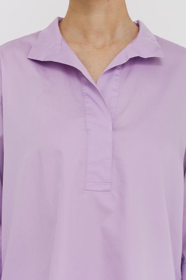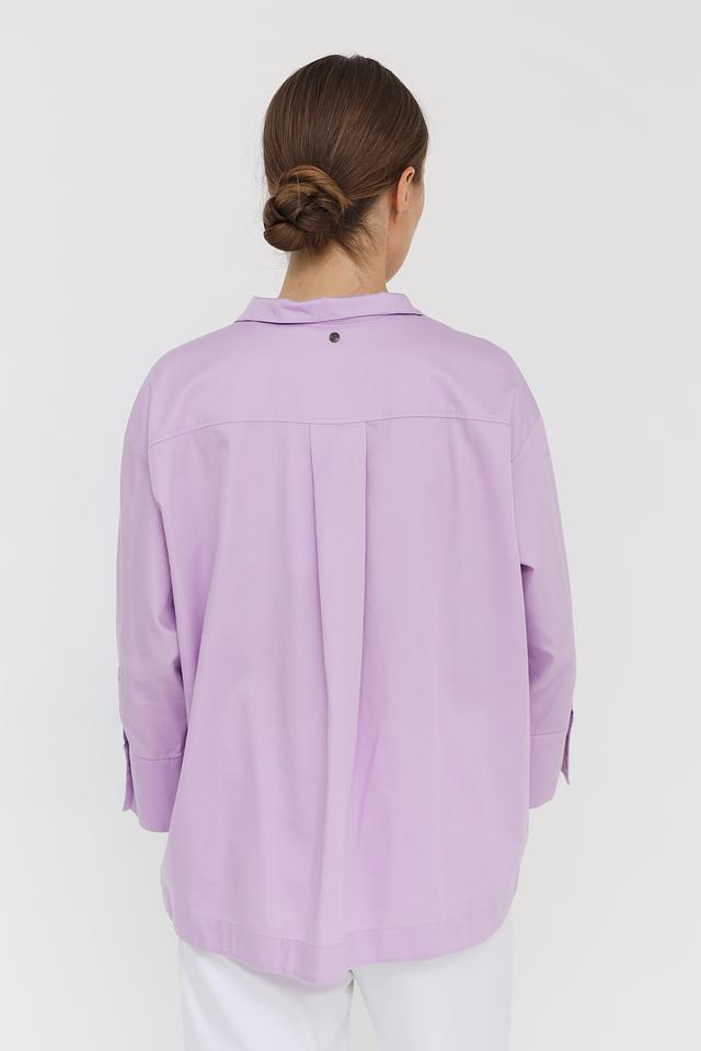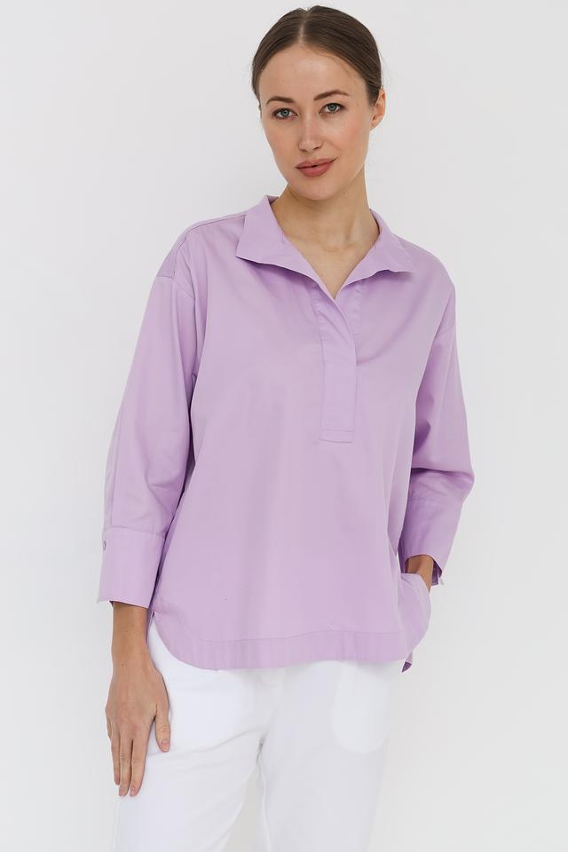 Блуза застегивается на небольшую планку с одной пуговицей в тон ткани. Рукава длиной 3/4 с манжетами. Спинка дополнена небольшими складками для более свободной посадки. Цвет блузы — нежный лавандовый, который легко сочетается с различными элементами гардероба.