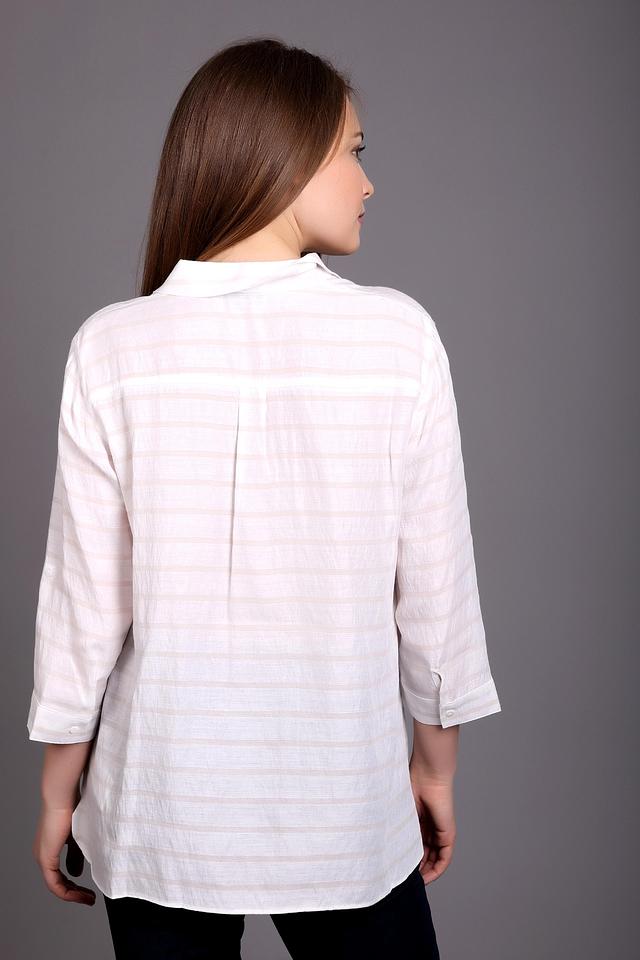 Блуза имеет прямой крой, воротник и застёжку на пуговицы. Рукава длиной три четверти с манжетами, которые можно регулировать. Спинка дополнена небольшими складками, что обеспечивает более свободную посадку.