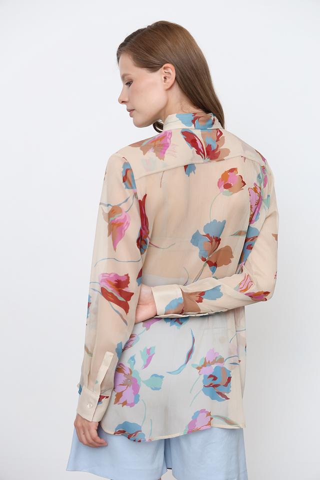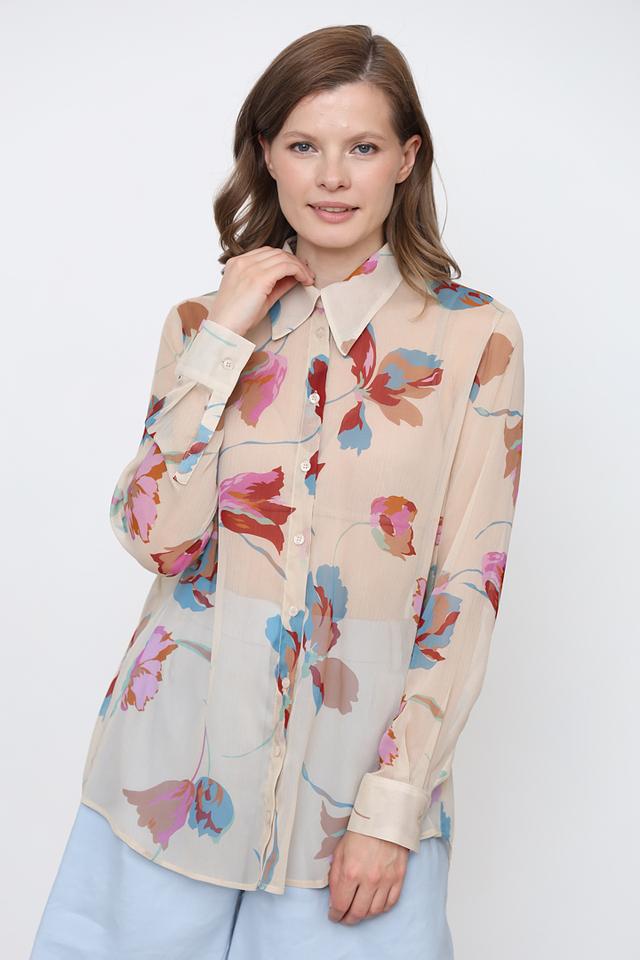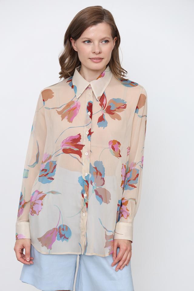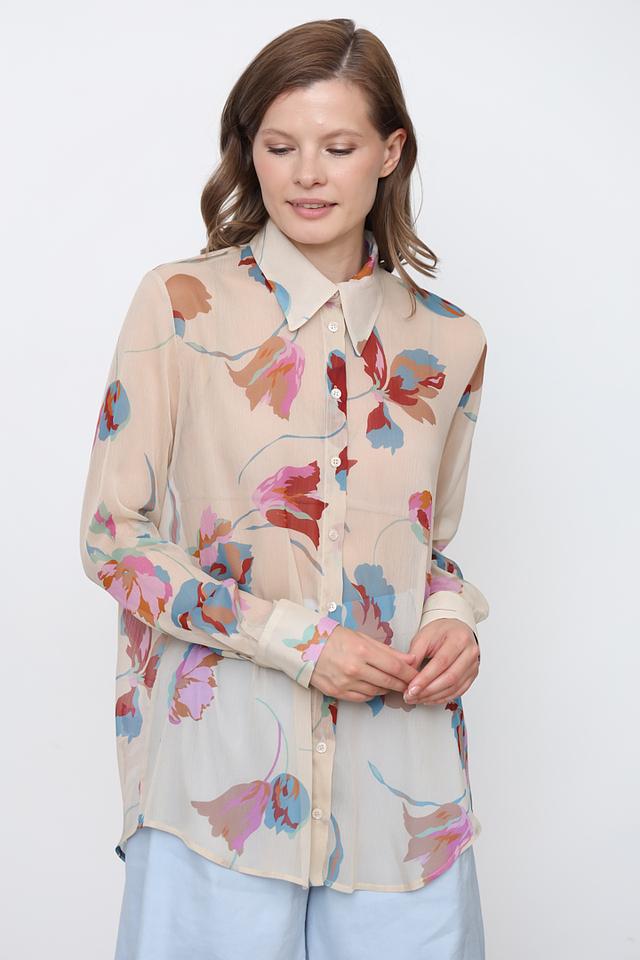 Женская рубашка Icona бежевого цвета с ярким цветочным принтом станет стильным дополнением к вашему гардеробу. Модель выполнена из лёгкой ткани и имеет классический крой с длинными рукавами. Состав: полиэстер 100%