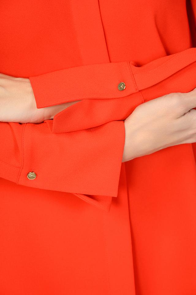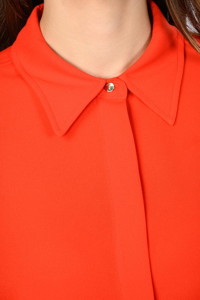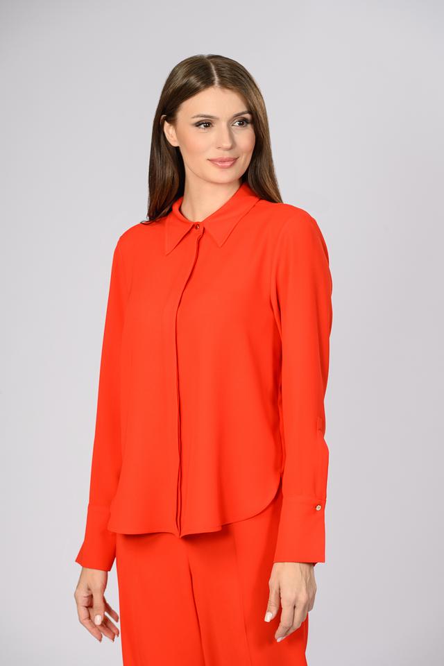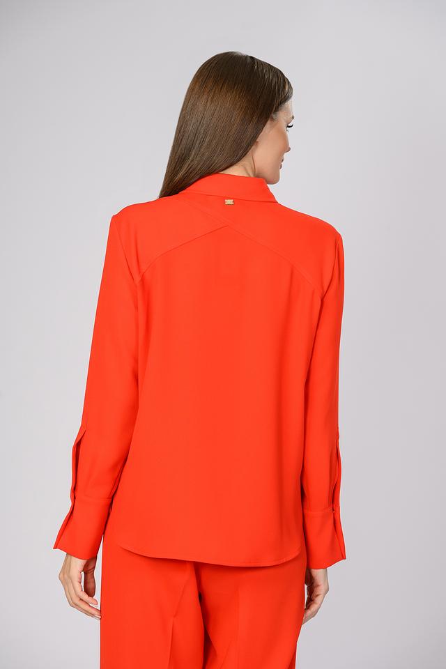 Блузка имеет классический крой с длинными рукавами и воротником. Застежка на пуговицы добавляет функциональности и позволяет регулировать степень прилегания. Яркий красный цвет привлекает внимание и подчеркивает индивидуальность.