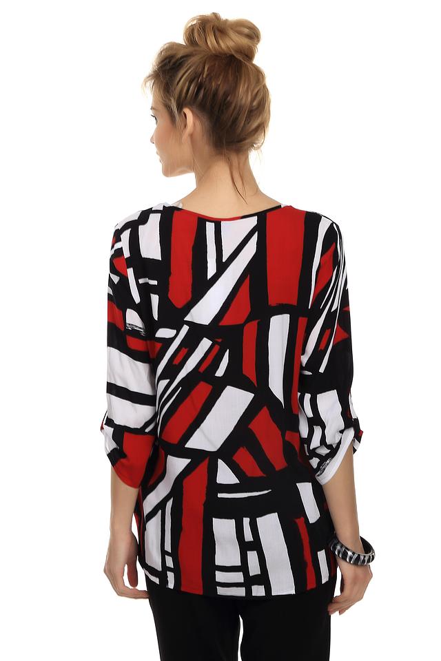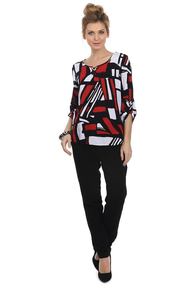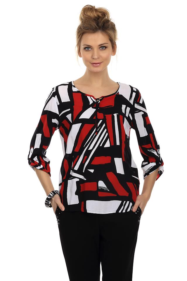 Элегантная блуза от бренда Lebek – идеальный выбор для создания стильных и уверенных образов. Оригинальный геометрический принт в черно-красных тонах добавляет динамичности и привлекает внимание.