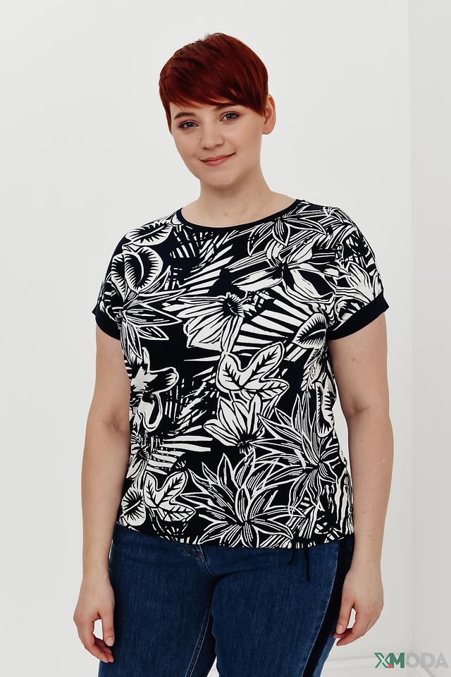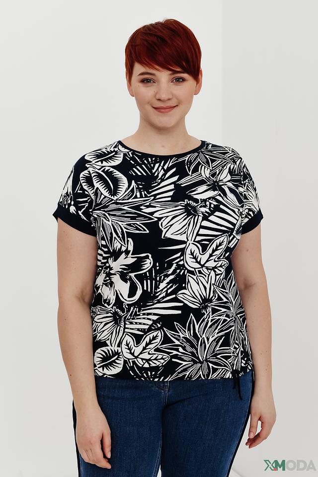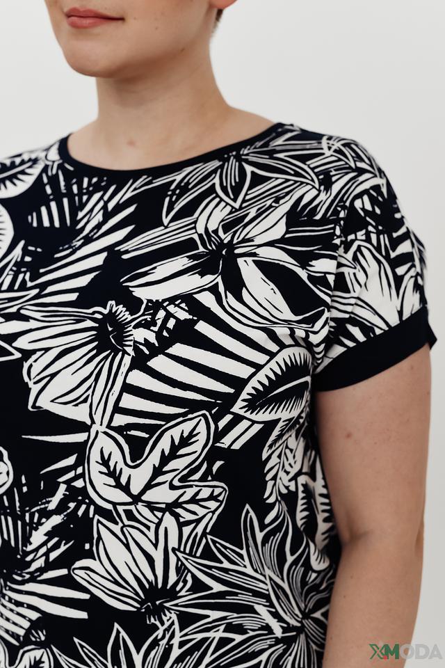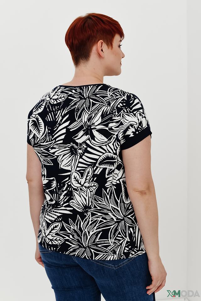 Основной цвет блузы – чёрный, а её главным украшением является яркий и сочный тропический принт, состоящий из различных листьев и цветов. Принт покрывает всю поверхность изделия, делая его запоминающимся и привлекательным.