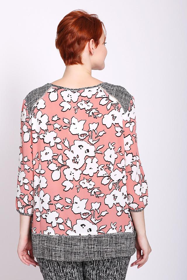 Блуза Lebek персикового цвета с цветочным принтом и отделкой в клетку. Модель имеет свободный крой, 3/4 рукава и декоративную сборку на плечах. Состав: полиэстер 97%, эластан 3%