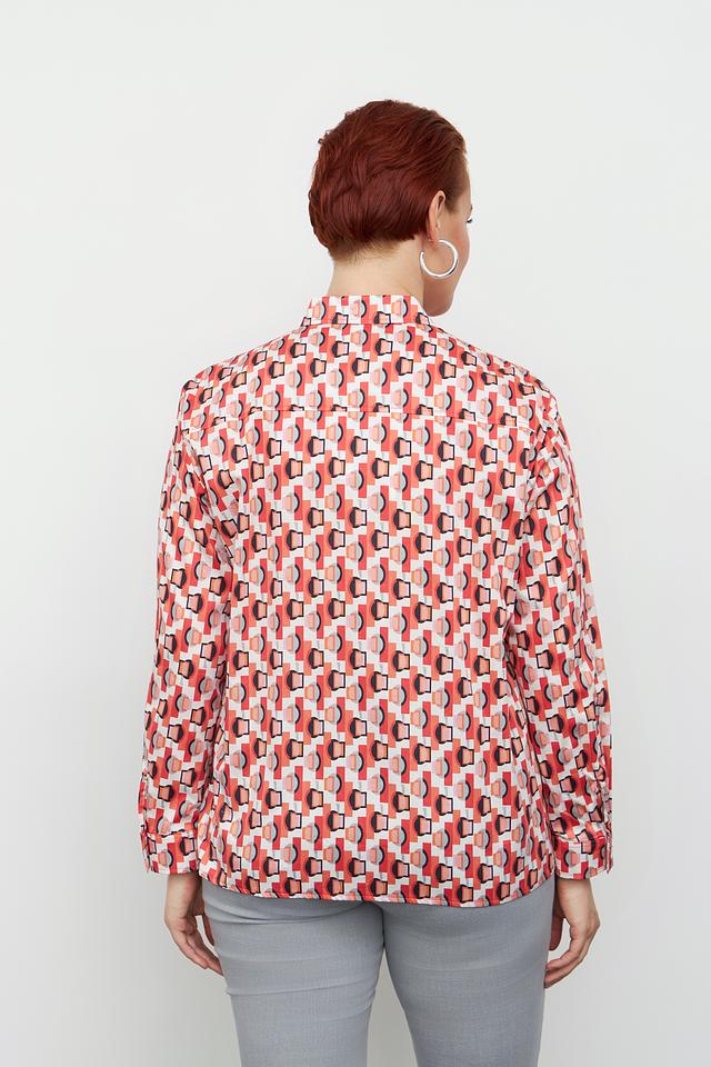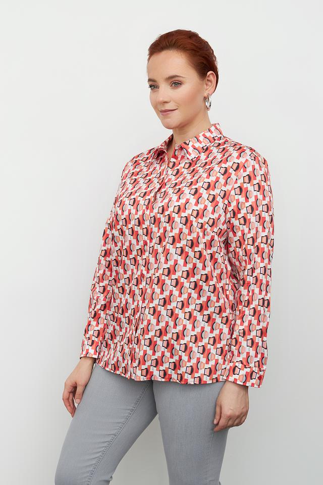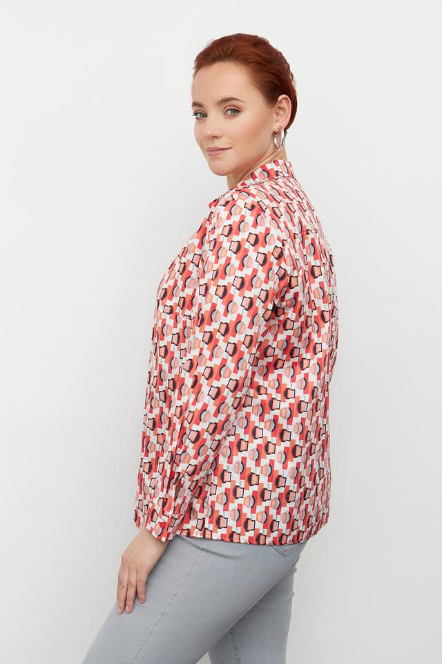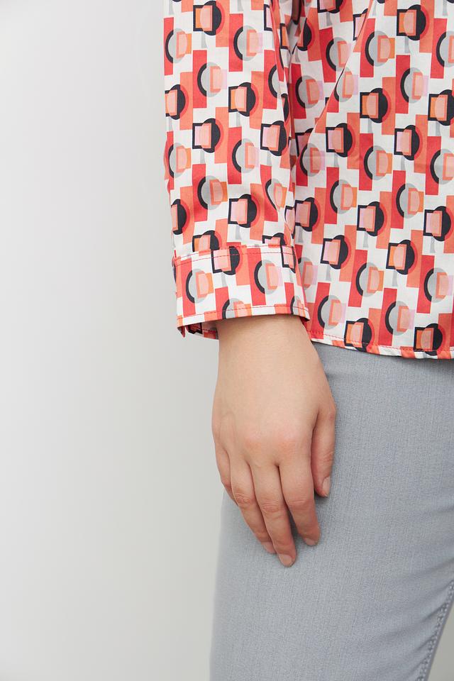 Блуза имеет классический крой с длинными рукавами и отложным воротником. Особенностью модели является оригинальный геометрический принт в оранжево-белой гамме, который придает ей современный и динамичный вид.